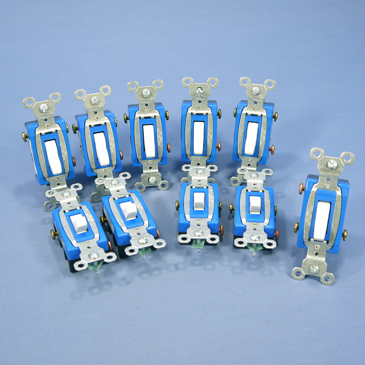 10 Pass & Seymour CS15AC3-W white toggle switches. Commercial Specification Grade, 3-way, side wired, grounding, rated 15A 120/277VAC. Features include: