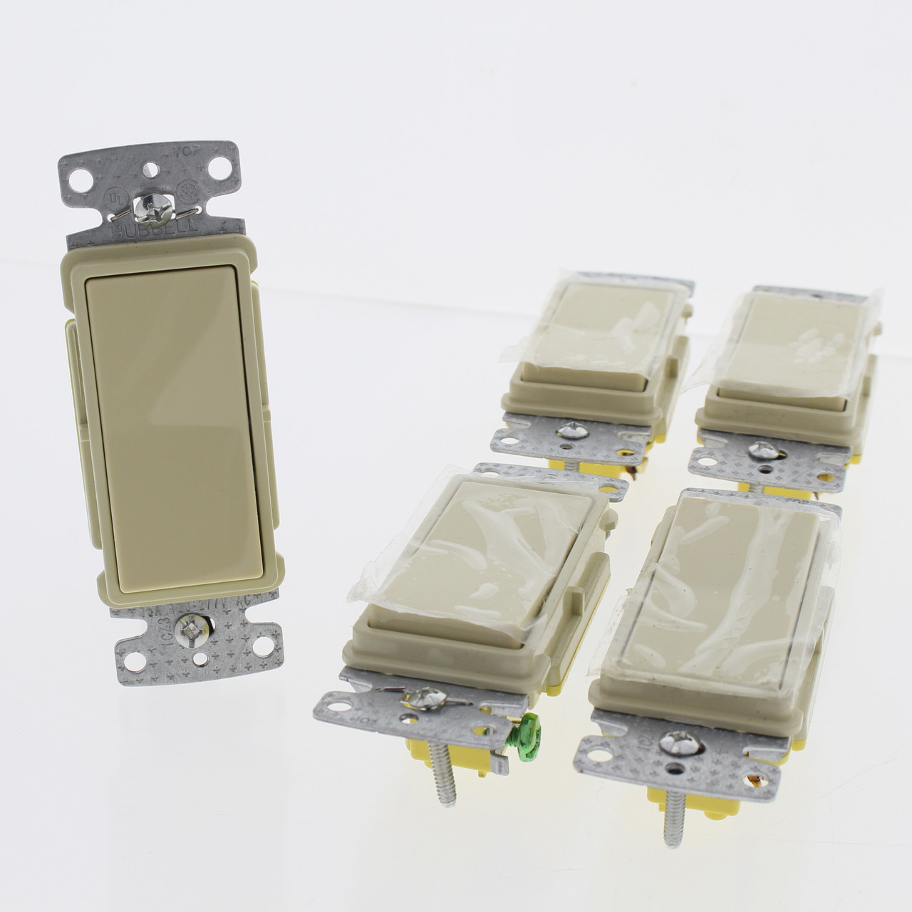 5 Hubbell tradeSELECT RSD115I ivory decorator rocker switches. Residential Grade, single-pole, side-wired and push-in, self-grounding, rated 15A 120/277VAC. Features include: