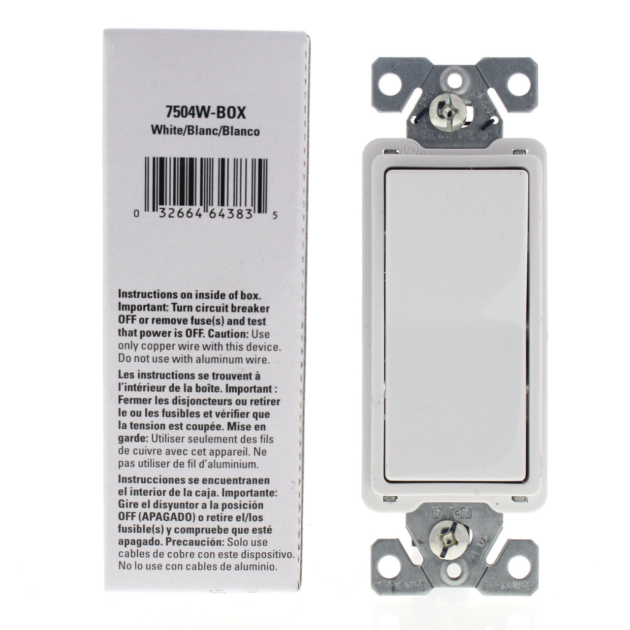 Eaton 7504W white Decorator rocker switch. Residential/Standard Grade, 4-way, grounding, push-in and back wired, rated 15A 120/277VAC. Each is individually packaged; packaging may differ from photo. Features include:
