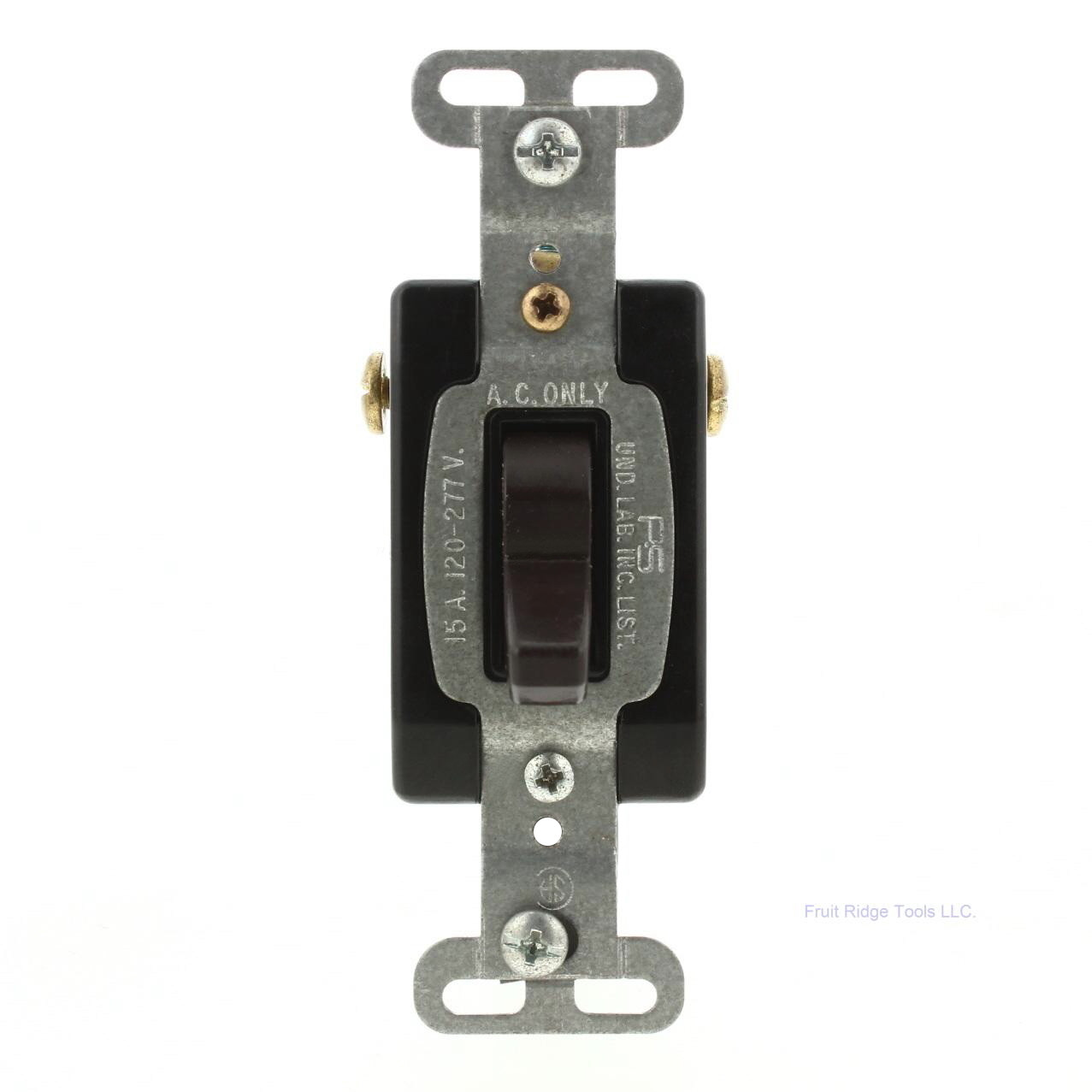 Pass and Seymour 15AC3 brown toggle switch. This is Industrial Specification Grade, grounding, 3-way, back and side wired, rated 15A 120/277V AC. Each is individually packaged with instructions. Item does not come with original packaging. Features include: