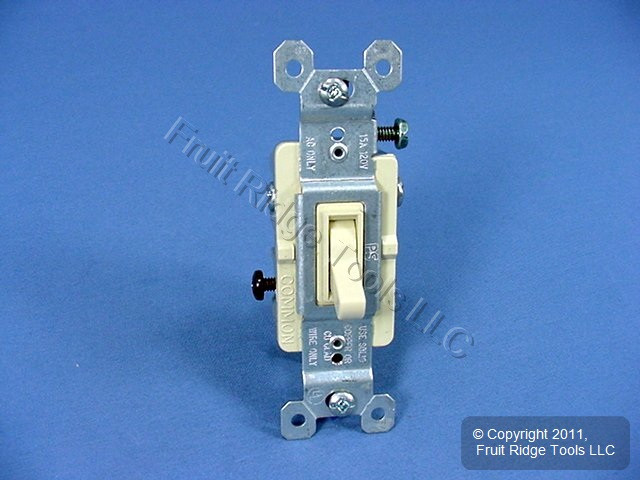 Pass & Seymour 663-IGU ivory toggle switch. Residential Grade, 3-way, grounding, push-in and side wired, rated 15A 120VAC. Bulk packed loose with no individual packaging. Features include: