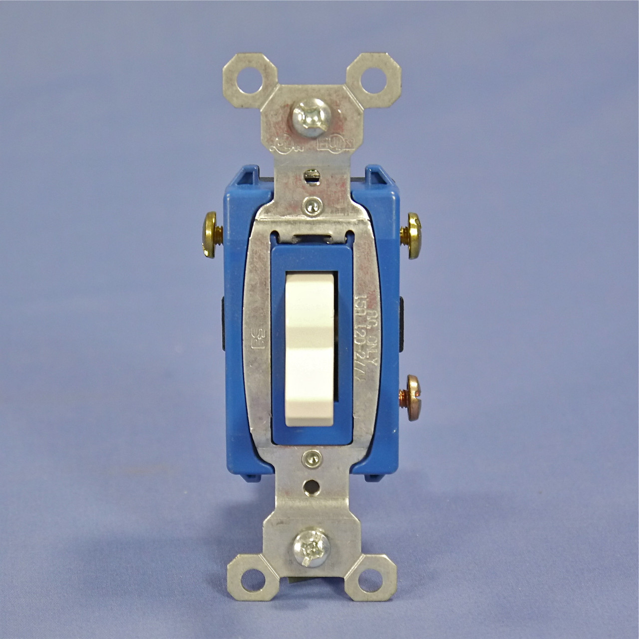 Pass & Seymour CS15AC3-LA light almond toggle switch. Commercial Specification Grade, 3-way, side wired, grounding, rated 15A 120/277VAC. Bulk packed loose with no individual packaging or instructions. Features include:
