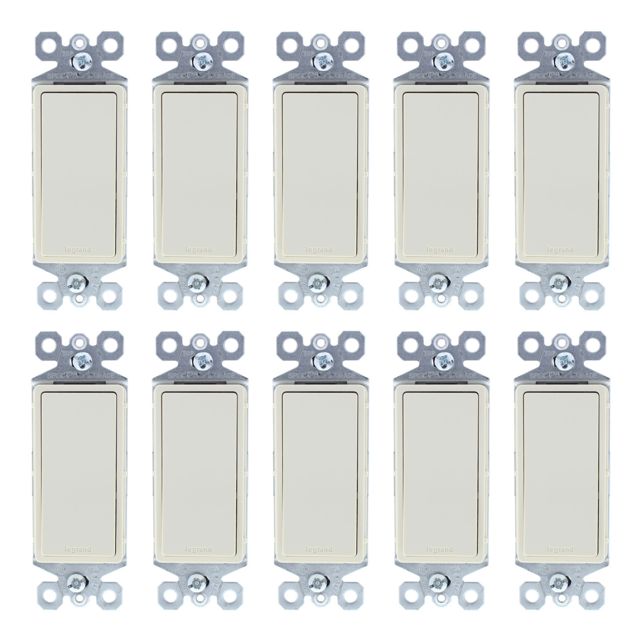 10-pack Pass & Seymour Legrand TM870LA light almond Decorator rocker switch. Please Note!! This is the newer style and has "Legrand" stamped on the face of the switch. Bulk packed loose with no individual packaging or instructions. Features include: