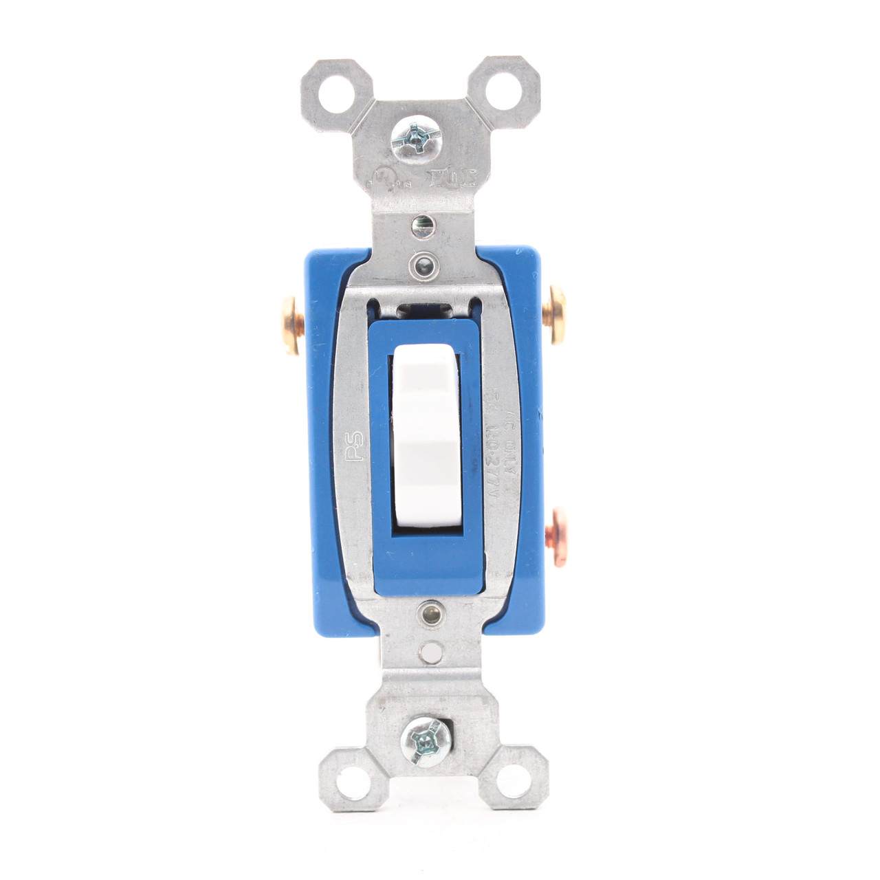 Pass & Seymour CS15AC3-W white toggle switch. Commercial Specification Grade, 3-way, side wired, grounding, rated 15A 120/277VAC. Bulk packed loose with no individual packaging or instructions. Features include: