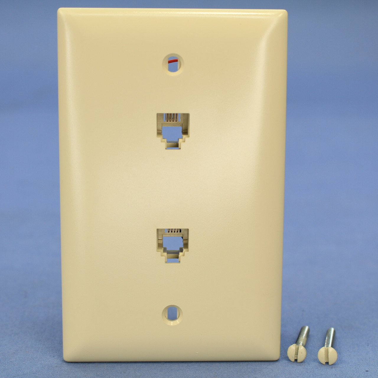 Pass and Seymour TPTE2-I ivory dual telephone jack plate. Used with standard 4-wire residential phones. Type 625B4, 4-conductor, RJ11, flush mount jack with screw terminals on the back. Each is individually packaged with instructions and color matching mounting screws. Mar-resistant wall plate, standard Trademaster size, measuring 4.6875"h x 2.9375"w.