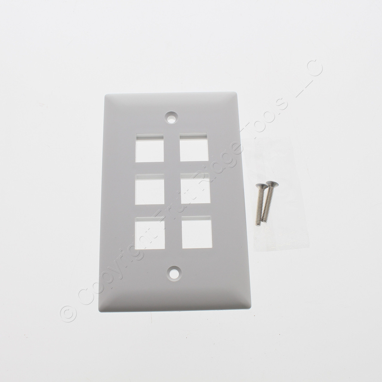 Pass and Seymour/Legrand On-Q WP3406-WH white single gang 6-port keystone wallplate. Constructed of a high impact flame resistant plastic. Standard size, measuring 2.94"W x 4.69"H. Each is individually packaged; packaging may differ from photo. Fits standard keystone jacks.