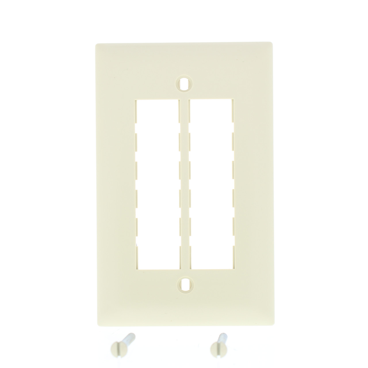 Pass and Seymour TradeMaster TPD6-I ivory blank 6-port DataCom wallplate. Flush mounted design that accepts On-Q snap-in modules for your audio, video, and telecommunications needs. Can be mounted to recessed wall boxes and brackets for a low profile look; also attaches to surface mount wiring boxes. Includes color matching mounting screws. Measures 4.69" H x 2.94" W. Each is individually packaged; packaging may differ from photos. Features include: