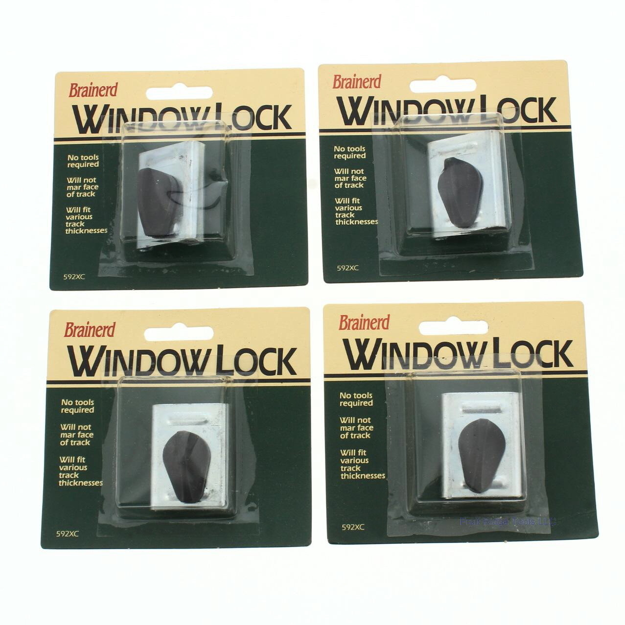 4 Brainerd 592XC Easy to Use METAL Sliding Window Track Lock and Ventilation Devices. Designed to fit various track thickness without marring the face of the track. Securely Locks Sliding Window In Closed Or Ventilating Position. Instantly locks sliding windows -no drilling or tools needed. Prevents window from being forced or pried open from outside; easy removal and reusable. Fits most vertical or horizontal sliding windows. Turn the lever one way to lock the window; turn it the other to allow it to slide. Other locks use a thumbscrew instead of a lever. Each is individually packaged; packaging may differ from photo. Features include