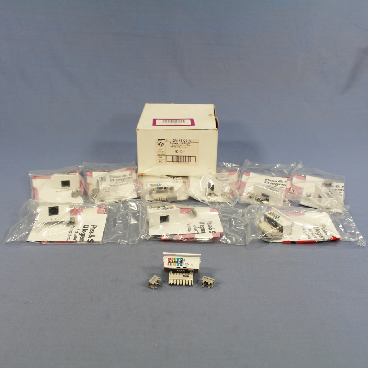 10 Pass & Seymour 2A145-C3-WH white Category 3 jacks. An 8-conductor RJ-45 jack that features dual color coded label for both T568A and T568B wiring patterns. Good for Cat 3 data communications or 8-wire phone systems. This is a 1-unit high module with one jack opening. Compatible with Pass & Seymour Activate wallplates and surface mount boxes. Activate components are specifically geared toward fiber optic, data, and enhanced audio/video applications. They provide a level of customization that is not often available through other systems. Front-loading, snap-in inserts simplify configuration and speed installation.