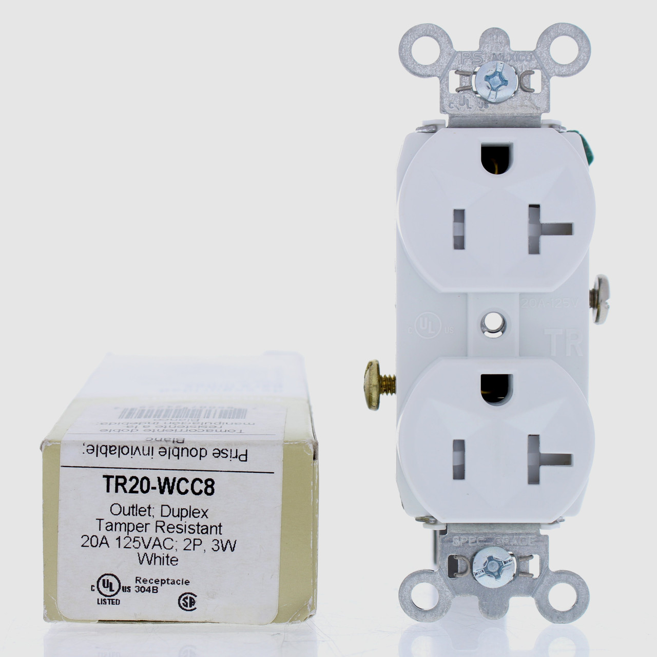 Pass & Seymour TR20-WCC8 white tamper resistant duplex receptacle. Designed for the hard use of commercial installations. Commercial Specification Grade, NEMA 5-20R, 2-pole, 3-wire, grounding, rated 20A 125V. Each is individually packaged; packaging may differ from photo. Features include: