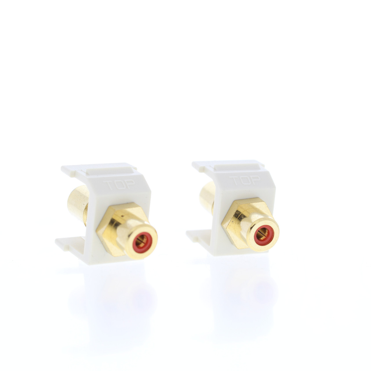 Hubbell SFRCRFFLA light almond Snap-Fit RCA keystone jack with a red center. Front has an RCA jack with a red center; back also has RCA jack with a red center, no soldering required. Create a seamless look in your house with all of your audio/video equipment remotely located - have your video equipment at the back or side of the room and route the cabling to a wallplate behind your television - all of that messy wiring is now concealed. Also great for conference rooms, home theatre rooms, and class rooms.