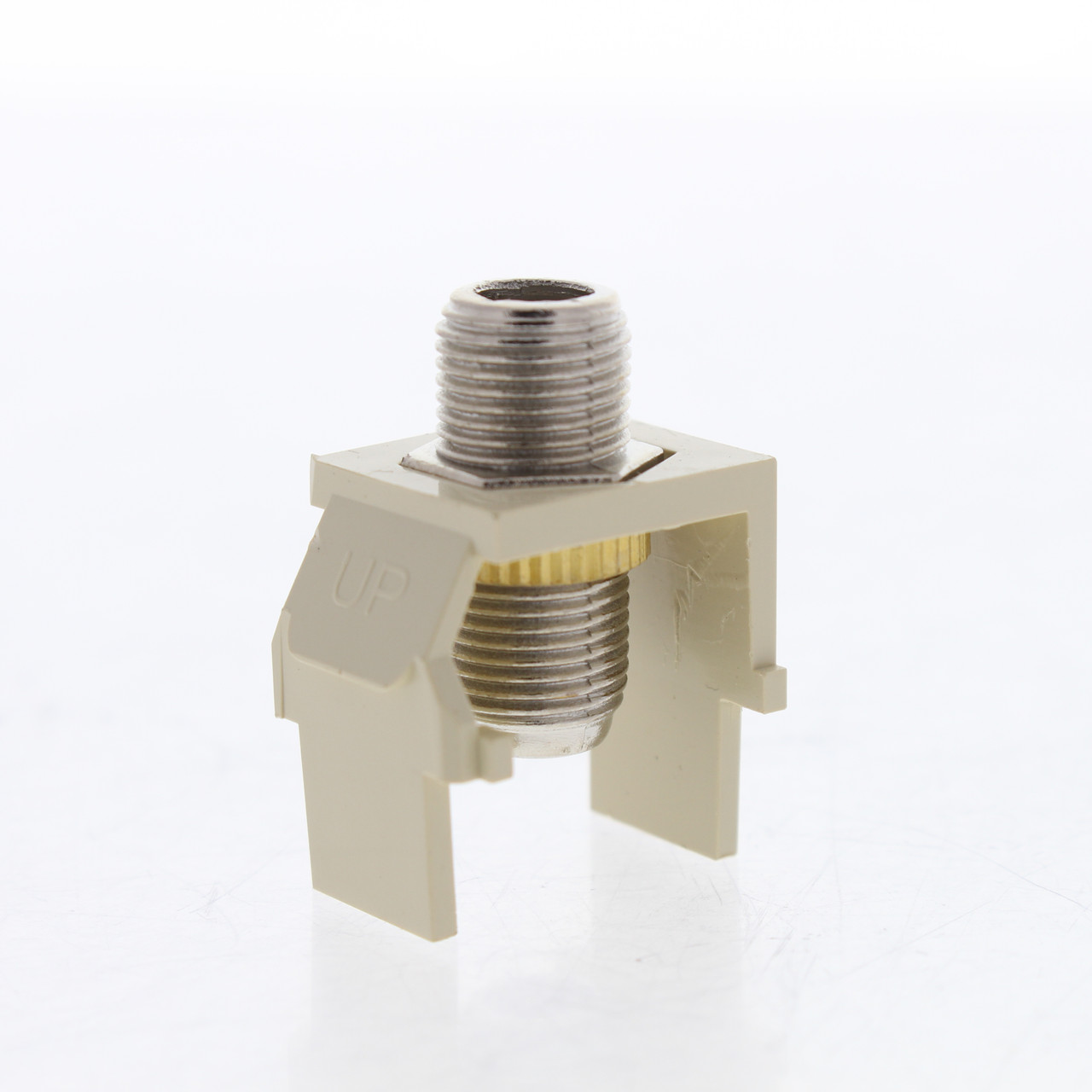 Leviton 40731-BI ivory Quickport coaxial cable jack. F-type connector for use with standard cable connectors. Standard coaxial cable fitting on both front and rear of the bulkhead - fits standard F-type cable connectors. For use with Levition Quickport wallplates and surface mount boxes. Nickel plated for an above average connection with TV, VCR, DVD, Satellite, and home theater applications. Each is individually packaged; packaging may differ from photo.
