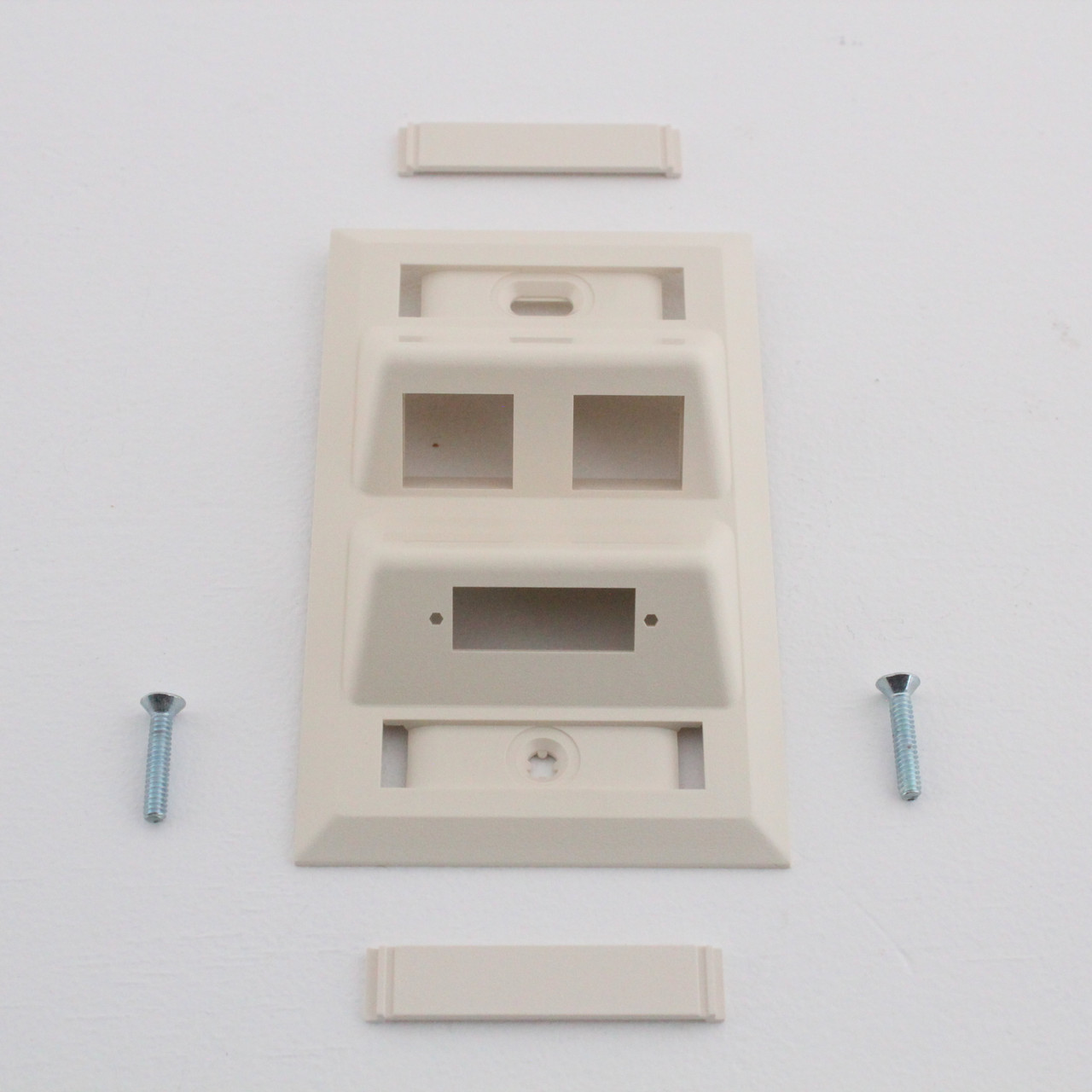 Hubbell AFP12SCDW "Office White" (beige) 2-port 1-gang I-Station angled keystone jack wallplate. Please note: Hubbell's "Office White" color is an off-white beige color; it is not a standard bright white - this is a special Hubbell color - popular in home offices, corporate offices, places of worship, etc. Has 2 keystone jack ports at the top and an opening for a VGA, fiber optic or similar jack at the bottom. Flush mount wallplate offers field-configurable flexibility in an attractive single-piece housing. Either match the jacks to the plate for a sleek look, or use different color jacks for easily visual identification. Packaging may differ from photo. Features include: