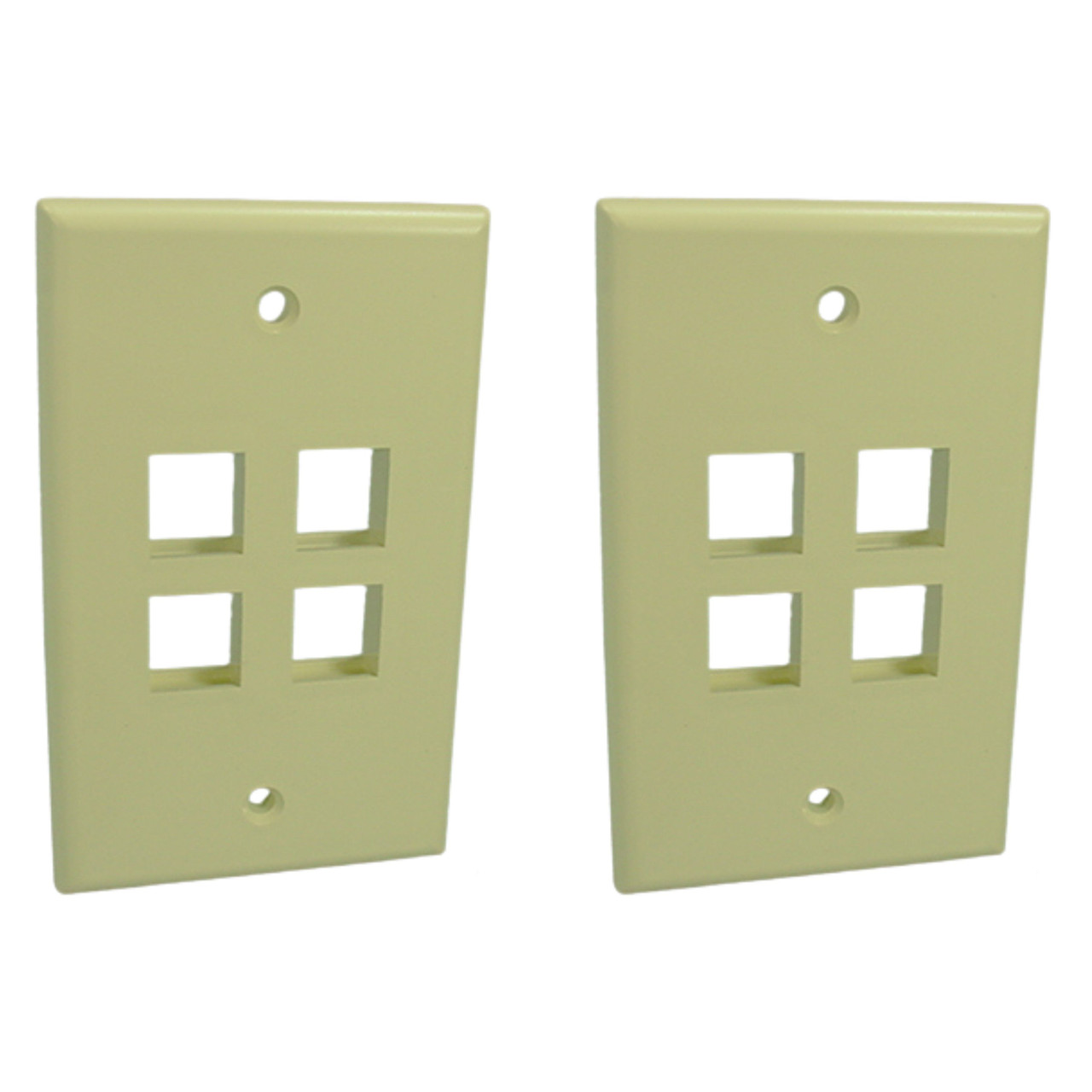 2 Leviton 41080-4IP ivory 4-port Quickport wallplates. Flush mounted design that accepts Leviton QuickPort snap-in modules for your audio, video, and telecommunications needs. Beware the knockoffs that claim Quickport compatibility; the fit is often loose and does not leave the jack flush with the face of the wallplate - only Leviton Quickport provides guaranteed secure insertion and flush mounting. Can be mounted to recessed wall boxes and brackets for a low profile look; also attaches to surface mount wiring boxes. Includes color matching mounting screws. Each is individually packaged; packaging may differ from photo. Features include: