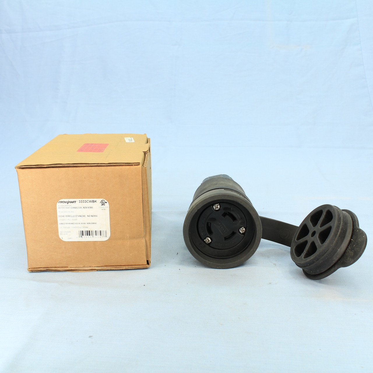 Cooper #3333CWBK black watertight locking connector. Cooper connector features a industrial specification grade and a back wire, non-grounding design. It has a voltage rating of 125/250V and a current rating of 30A. Superior design and performance makes it the ideal choice for industrial applications. It also has a 3-pole 3-wire Non-NEMA configuration and is made of durable thermoplastic. Each is individually packaged; packaging may differ from photos. Features include: