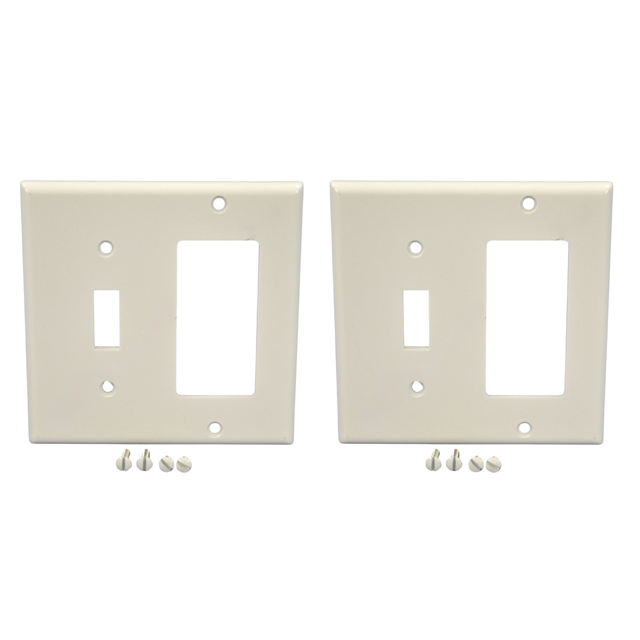 2 Leviton 80405-W white combination Decora and toggle switch wallplates. Residential Grade, standard size (4.5"h x 4.56"w) with a rectangular opening that will fit Decora or GFCI devices. Features include: