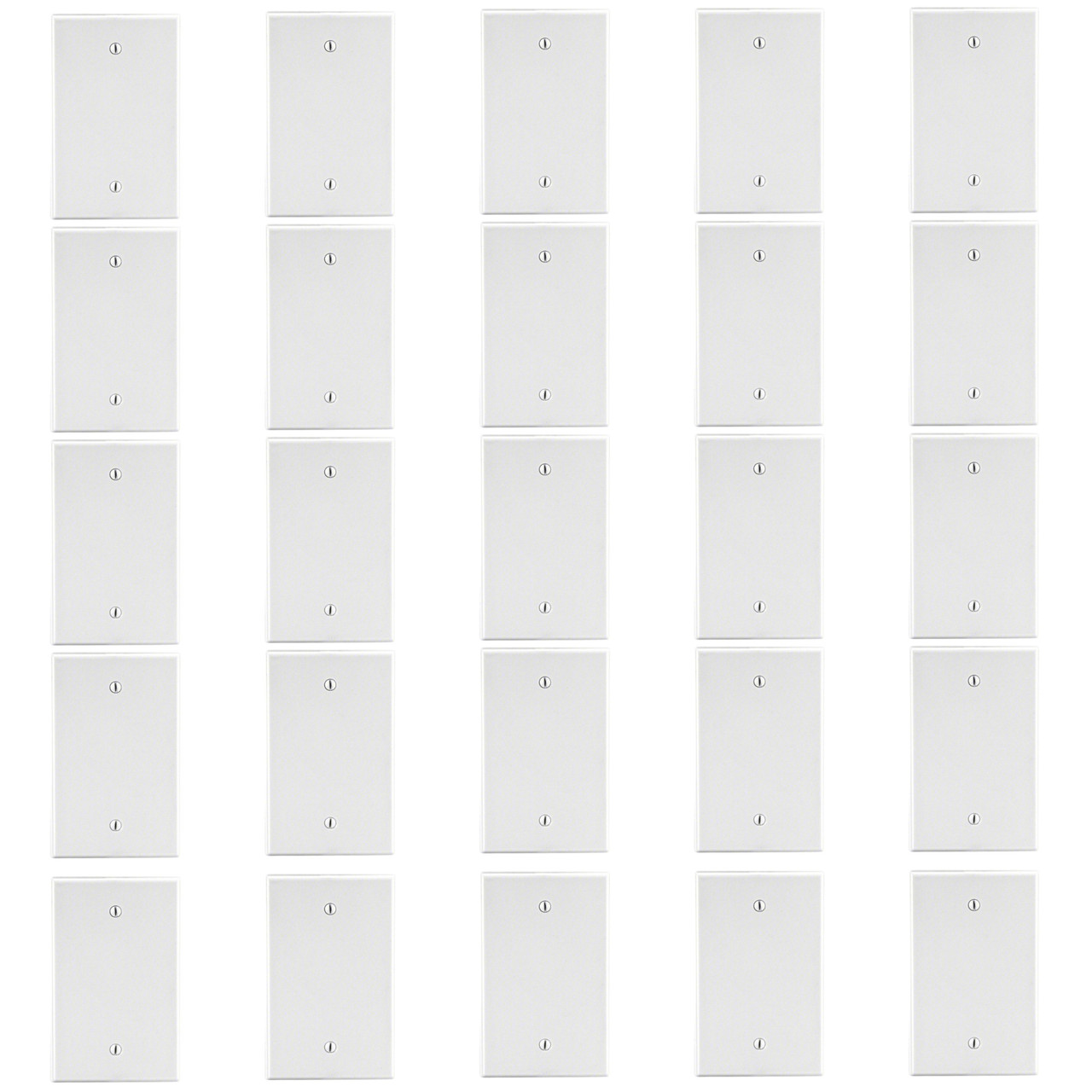 25-Pack Hubbell P13W white 1-gang blank box mount wallplates. Commercial grade with slightly oversize dimensions, measuring 4.62"h x 2.87"w to provide an extra 1/8" in length and width than standard plates from other manufacturers for increased coverage around irregular wall openings. Made of a tough virtually unbreakable nylon - do not confuse it with regular plastic residential plates which can chip or crack. Features include: