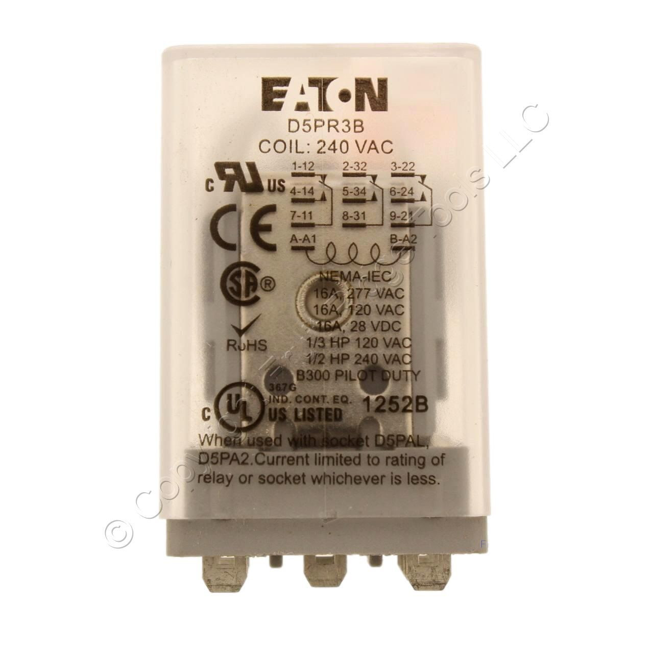 - Eaton D5 Plug-In Relay 3PDT 240VAC Coil 16A 7200 Ohm D5PR3B-A3
