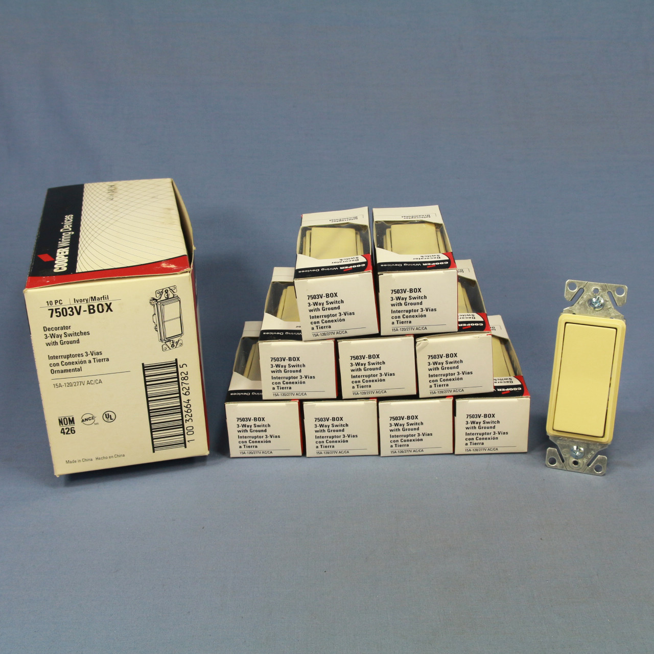 10 Cooper 7503V ivory Decorator rocker switches. They are Residential Grade, 3-way, grounding, Speedwire push-in, back and side wired, 15A 120/277VAC. Each is individually packaged; packaging may differ from photo. Features include: