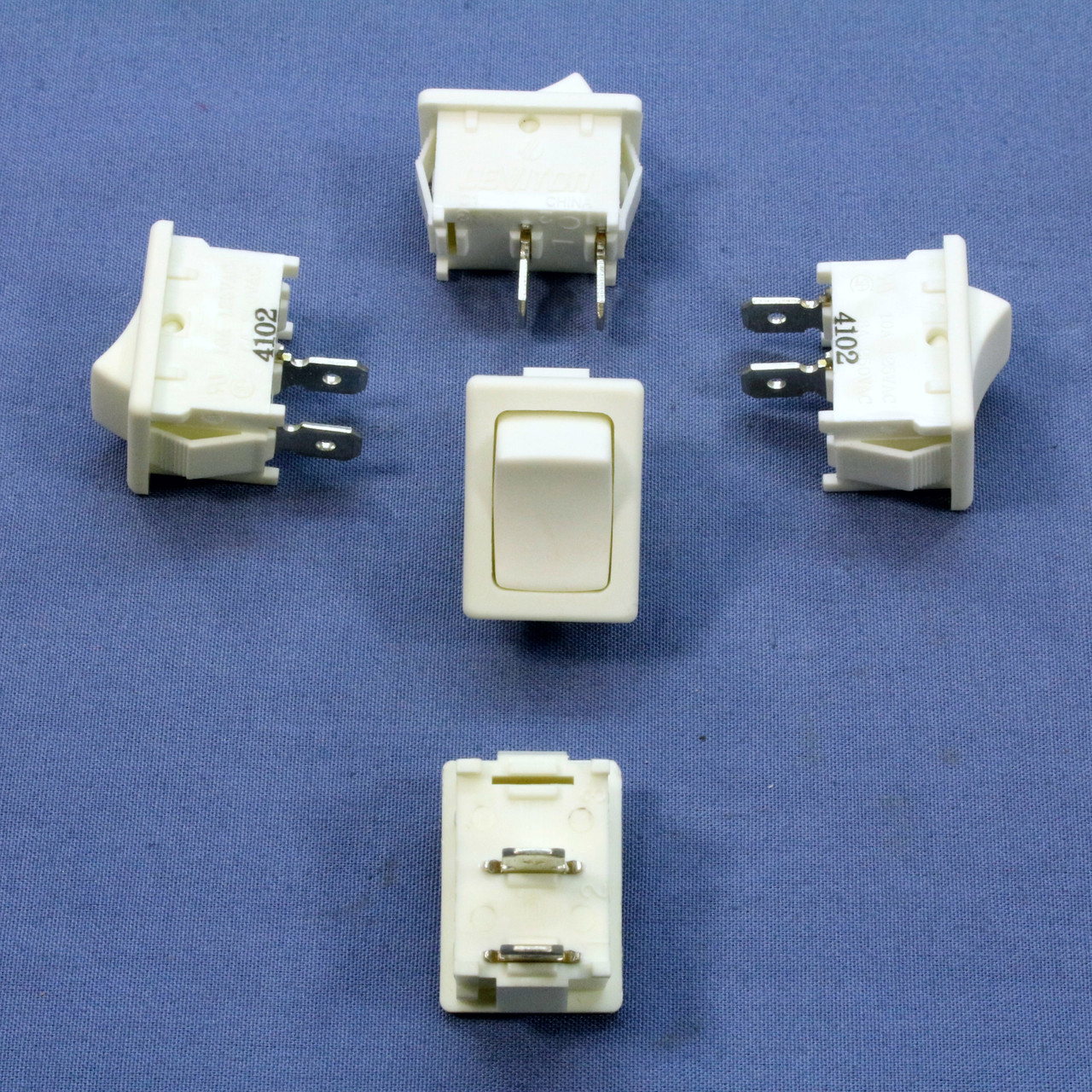 5 Leviton MR002 white mini rocker switches. Snap-in design fits in a standard 3/4" x 1/2" panel opening. Single pole, single throw, rated 10A 125V. Connection terminal spades are approximately 3/16" wide.