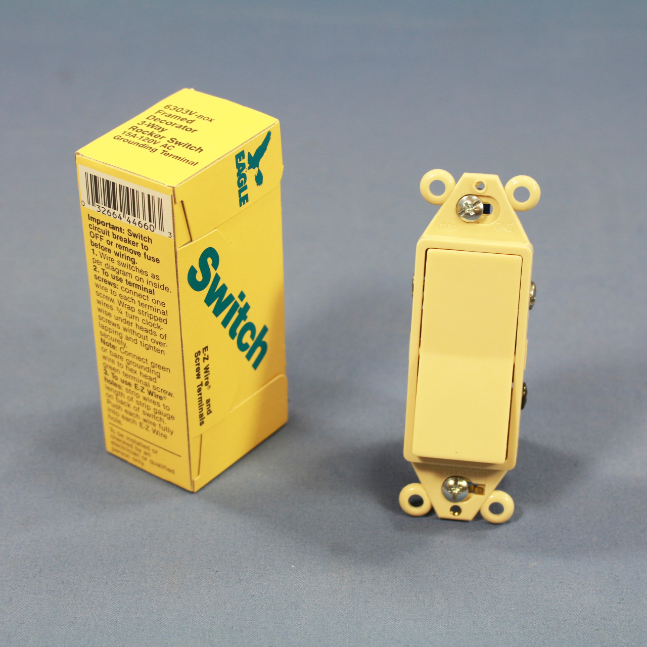 Eagle 6303V ivory Decorator rocker switch; Eagle is a division of Cooper Wiring Devices. Residential Grade, 3-way, grounding, push-in and side wired, rated 15A 120V. Each is individually packaged; packaging may differ from photo. Features include: