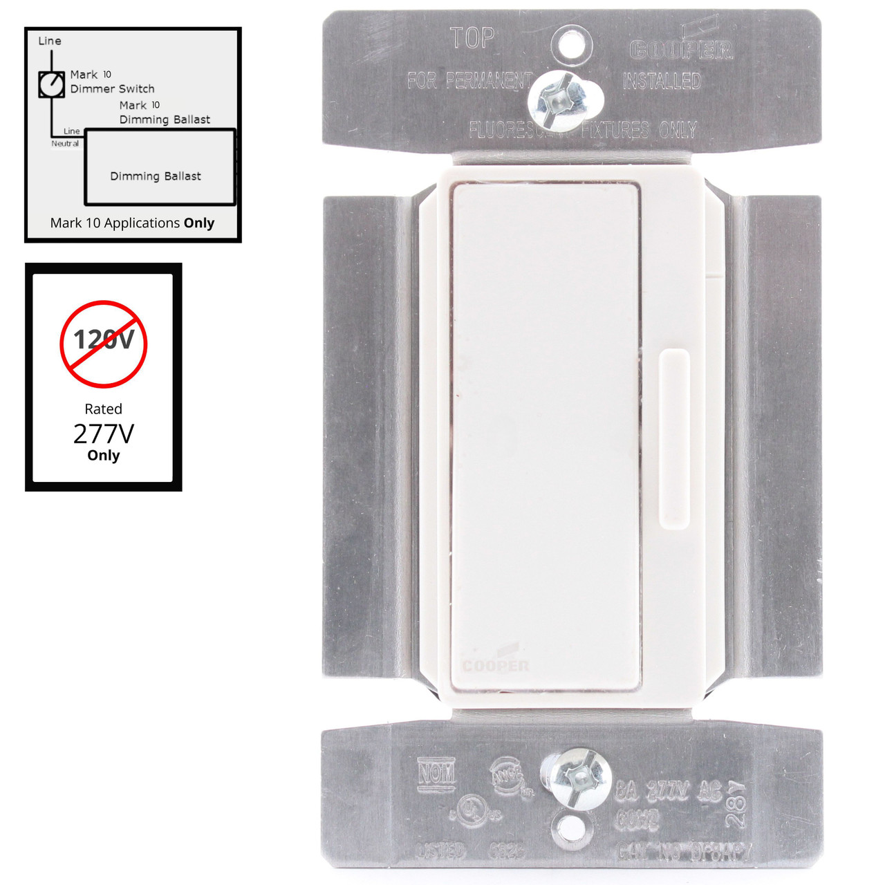 Cooper #DF8AP7-LA light almond preset decorator fluorescent dimmer. For use with fluorescent lighting with Mark 10, Ambistar or Tu-Wire compatible ballasts only. Provides a smooth, slide action full range dimming for fluorescent lighting. Dimmer is rated at 8 amps and 277 volts (does not work for 120V). Integrated linear slide control for easy, precise operation. Single pole or 3-way setup. Compatible with any decorator wallplate or screwless wallplate. Each is individually packaged; packaging may differ from photos. Features include: