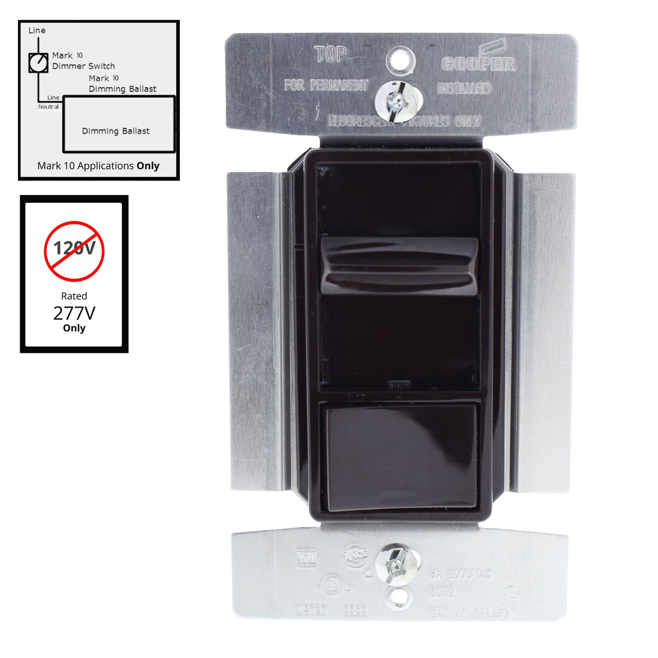 Cooper #SF8AP7-B brown preset slide dimmer switch. The Cooper switch provides smooth, slide action full range dimming for fluorescent lighting. Rated at 8 amps 277 volts for use with fluorescent lighting controlled but a Mark 10 ballast. Features a back and side wire terminal type and single pole or 3-way configuration. Each is individually packaged; packaging may differ from photos. Features include: