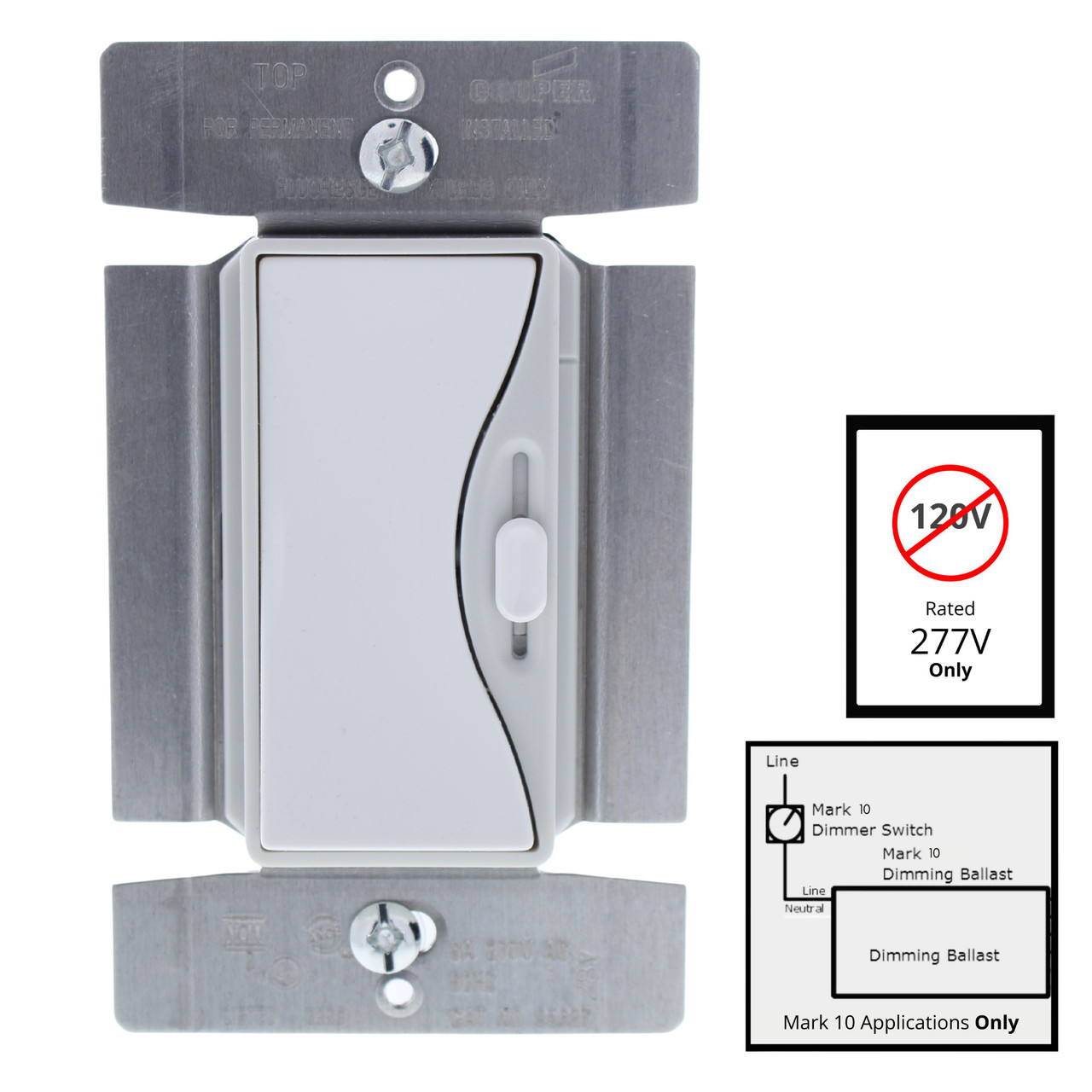 - Cooper Aspire White Satin (Pale Gray) 1-Pole/3-Way Preset Decorator Slide Fluorescent Dimmer 8A 277V (NOT 120V) w/Mark 10 Ballast ONLY 95687WS