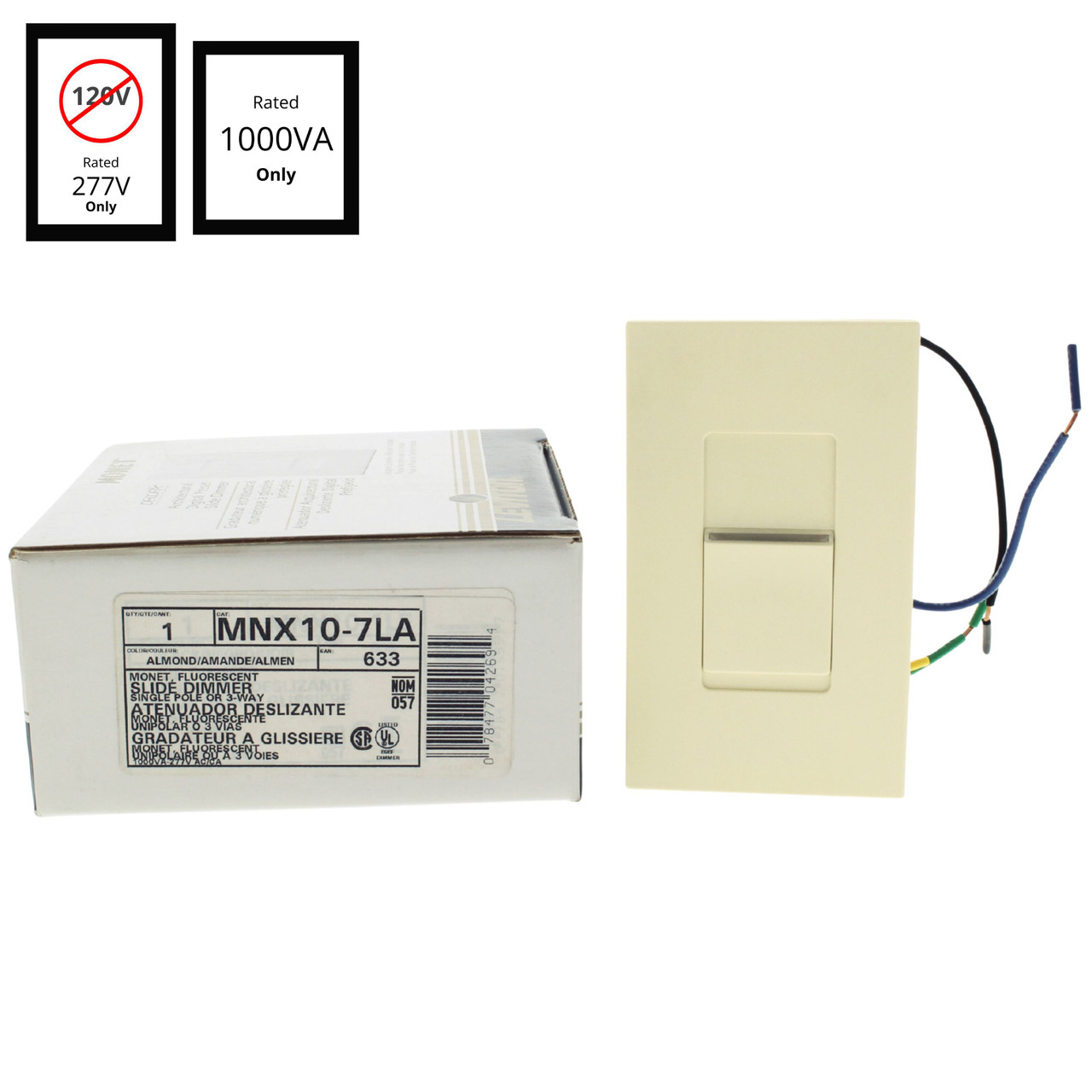 - Leviton Almond Monet Fluorescent Slide Light Dimmer Switch Ecotron Mark X 1000VA 750W 277V MNX10-7LA