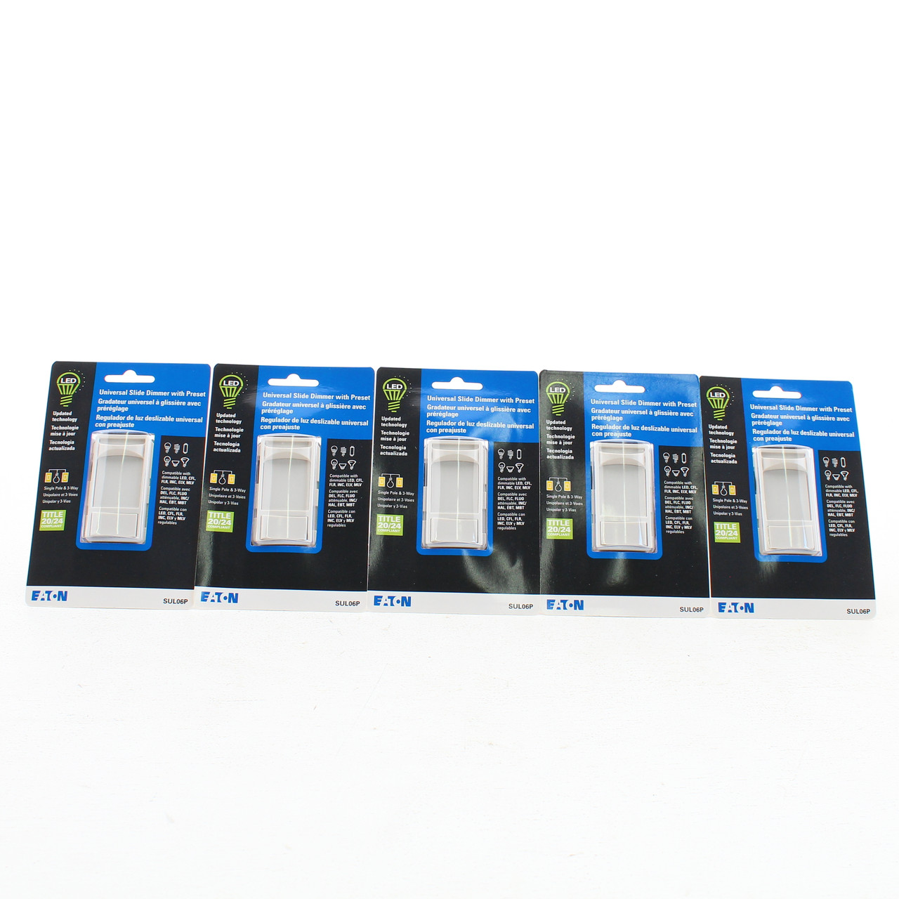 - 5 Eaton White Slide Dimmer Switches w/Preset LED/CFL/INC/HAL/FLR?ELV/MLV SUL06P