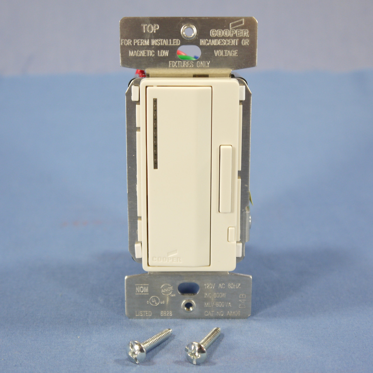 Cooper AIM06-LA-K light almond smart master dimmer with preset for incandescent and magnetic low-voltage lighting ONLY. Please note: dimmer will not work with LED or Compact Fluorescent (CFL) bulbs. Rated 600W/VA- 120V/AC for single pole or multi-location installations (up to 5 additional remote locations). Installation speed enhancements include virtually unbreakable, ultrasonically welded top and backbody, extra-long, extra-wide mounting straps and easy access ground screws. Air-gap switch disconnects power from load, forcing an OFF condition. Compatible with any decorator wall plate. Each is individually packaged; packaging may differ from photo. Features include: