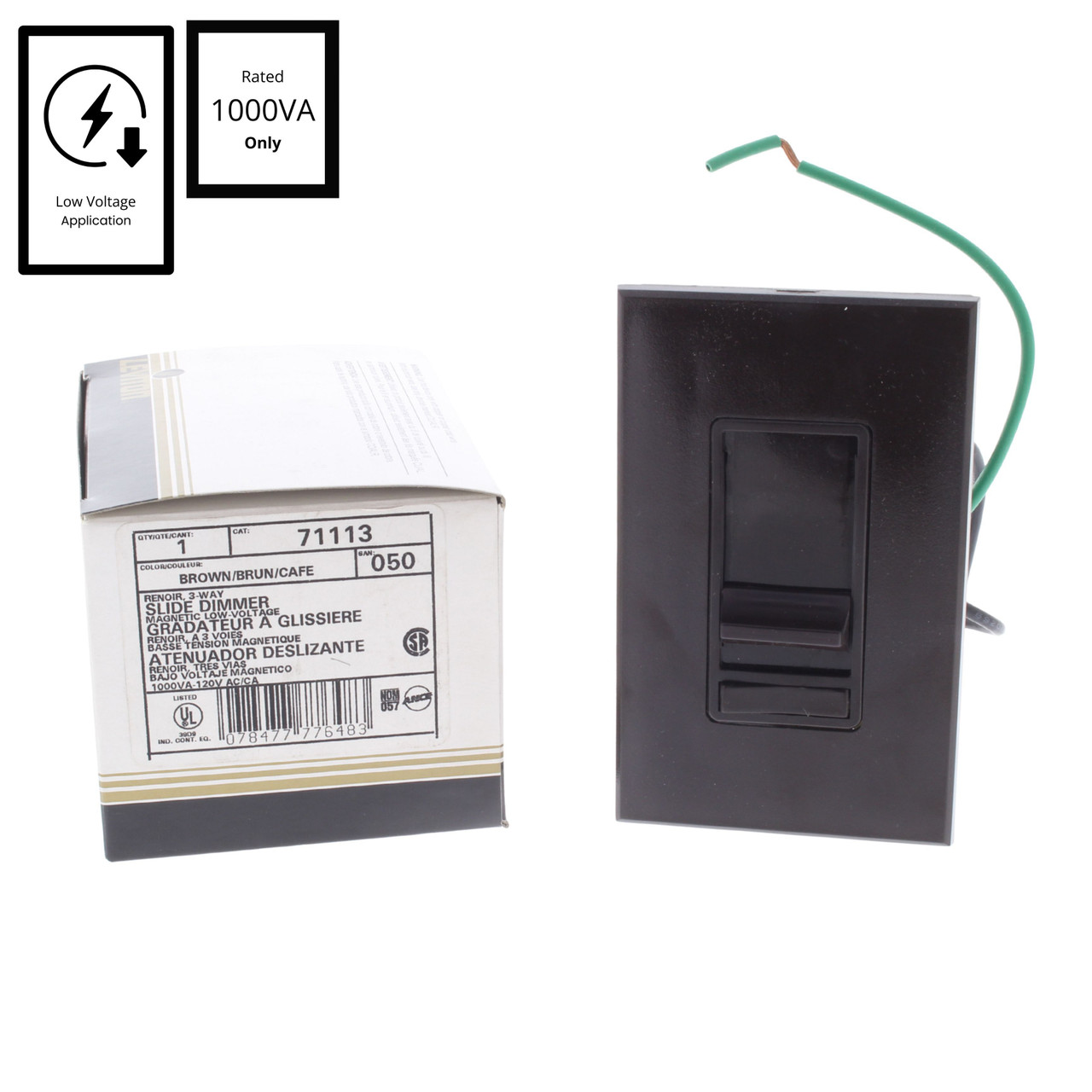 - Leviton Brown Renoir 3-Way Slide Dimmer Switch 1000VA Magnetic Low Voltage 1000W Incandescent 71113