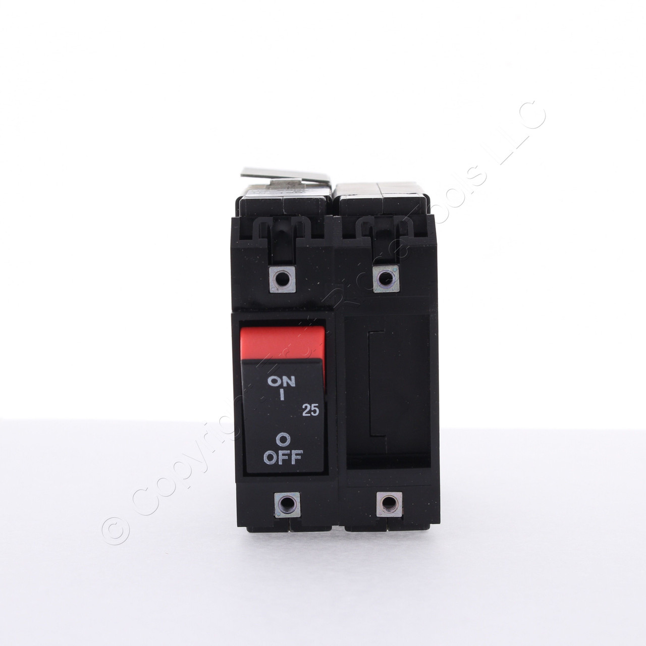 Bryant/Hubbell GFMDCB120252P circuit breaker. For use in a Hubbell/Bryant GFCI sensing module. GFCI sensing modules are typically used in portable generator integrations to protect all outlets on a generator. In a ground sensing module the load is interrrupted by way of a hydrualic magnetic circuit breaker utilizing a shunt trip coil. Rated 25A 120VAC 2-pole single phase.