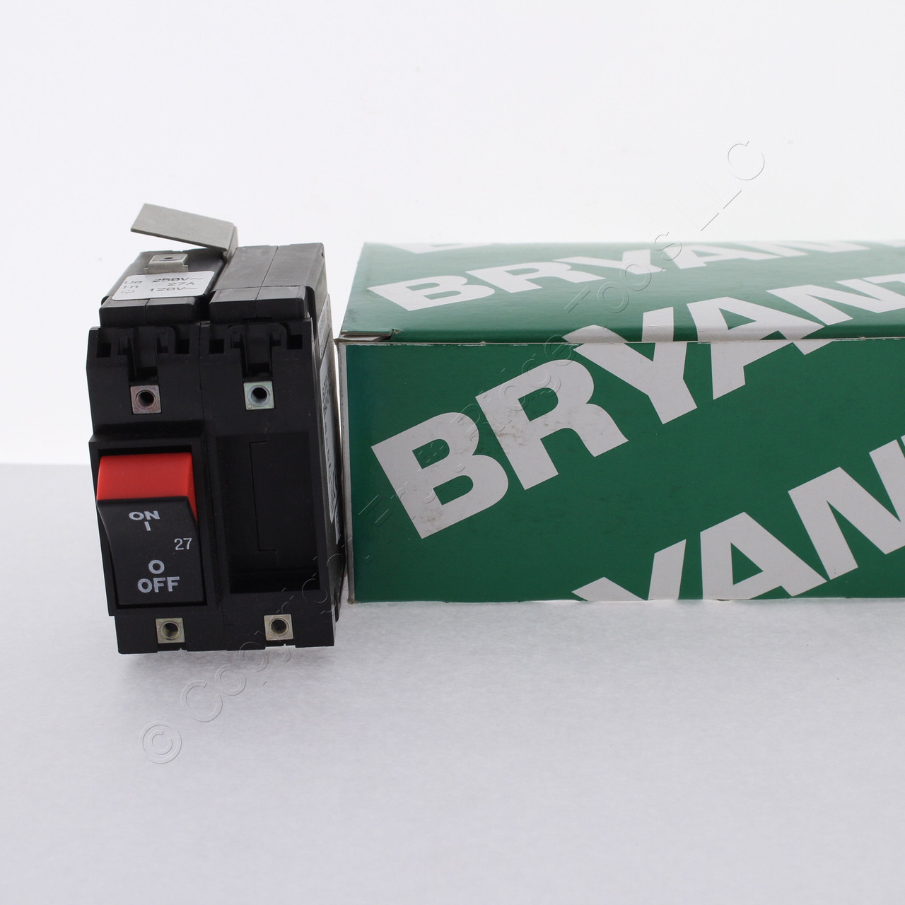 Bryant/Hubbell GFMDCB120272P circuit breaker. For use in a Hubbell/Bryant GFCI sensing module. GFCI sensing modules are typically used in portable generator integrations to protect all outlets on a generator. In a ground sensing module the load is interrrupted by way of a hydrualic magnetic circuit breaker utilizing a shunt trip coil. Rated 27A 120VAC 2-pole single phase.