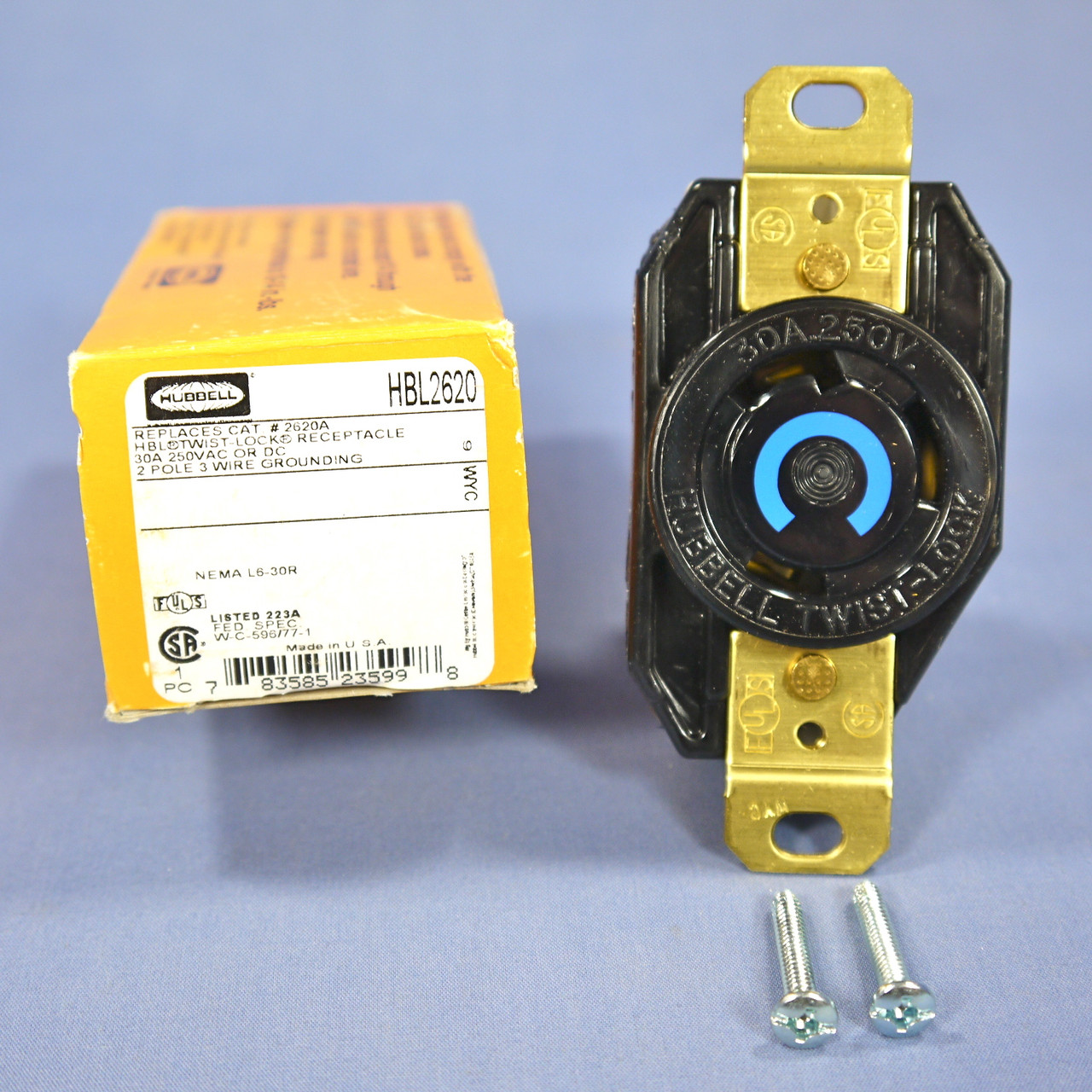 Hubbell HBL2620 locking receptacle. Industrial Specification Grade, NEMA L6-30R, 2-pole, 3-wire, grounding, rated 30A 250V. Each is individually packaged; packaging made differ from photo. Features include: