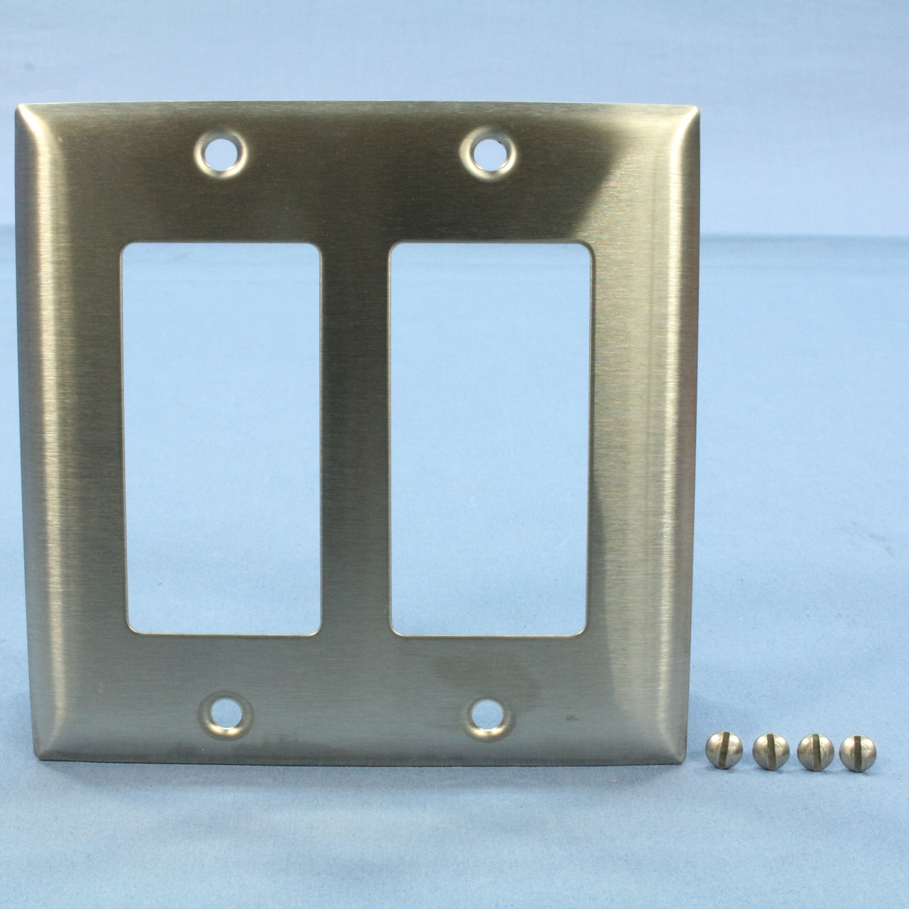 Hubbell SS262 stainless steel wallplate. Commercial Grade, 2-gang outlet cover made of type 302 stainless steel, a special non-magnetic alloy for sensitive electronic applications (also suitable for regular applications). Measures 4.5"H x 4.56"W; brushed finish has horizontal orientation. Each is individually packaged; packaging may differ from photos. Features include: