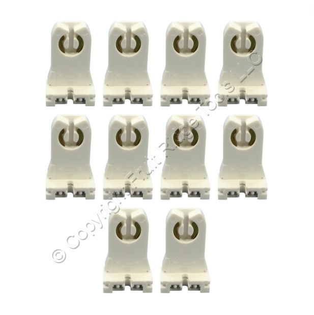 10 Leviton 13355 white fluorescent lamp holders (no disconnect feature) - for use with T-8 or T-12 lights. Tall profile slide-on design with 1.17" center lamp height. Each is individually packaged; packaging may differ from photos. Features include: