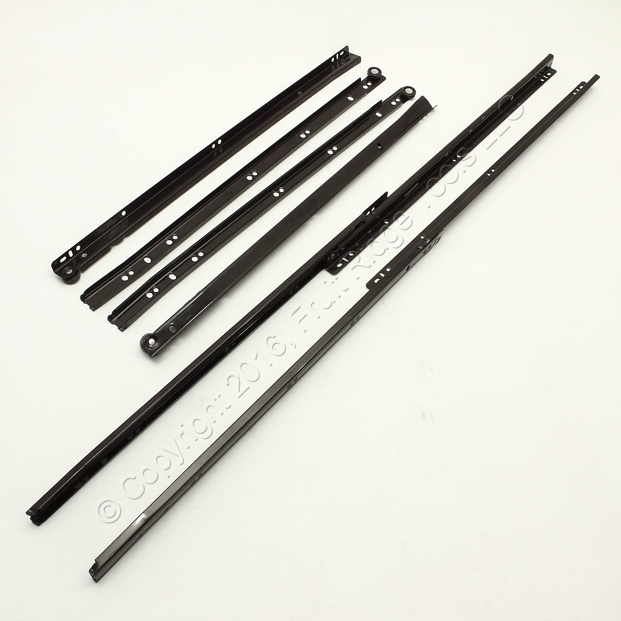 2 Pair GlideRite Hardware 80 lb. low-profile drawer slides. (1 pair is needed for 1 drawer and each pair is made up of 4 parts) Side-mounted, smooth action, Delrin wheels. These 3/4 extension drawer slides are among the quietest, smoothest and lowest profile slides on the market. An ideal choice for face frame cabinets, the slides are made from heavy gauge steel coated with easy-to-clean epoxy for maximum convenience and durability. The brown finish blends in well with a variety of wood species. Ideal use is in office furniture, cabinets, closets, kitchens and medical furniture. Meets or exceeds all BIFMA, BHMA and ANSI standards for quality. They measure 20" long and 1/2" thick with 15-1/4" total travel. Features include: