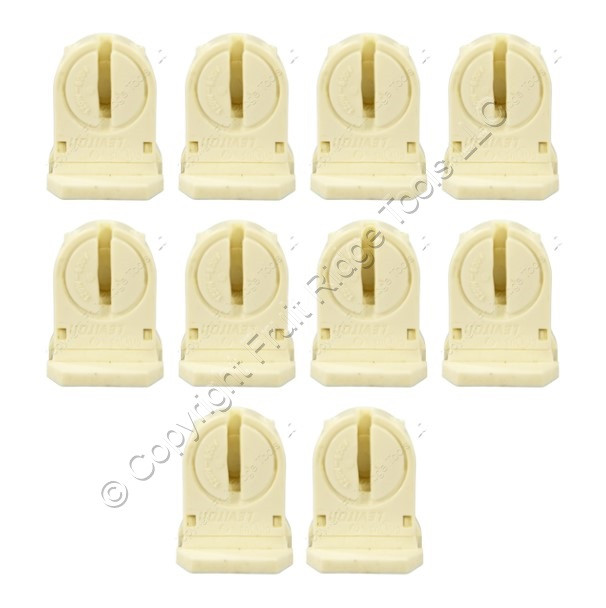 10 Leviton 23654-SNP fluorescent lampholders for miniature bi-pin lamps. Low profile design with 0.62" lamp center height. Snap-in/slide-on design with lamp-lock socket for high output, energy efficient T-5 lights. Features include: