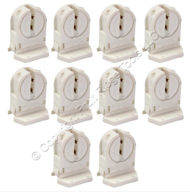 10 Leviton 13654-SNP fluorescent lampholders for miniature bi-pin lamps. Low profile design with 0.62" lamp center height. Snap-in/slide-on design with lamp-lock socket for high output, energy efficient T-5 lights. Features include: