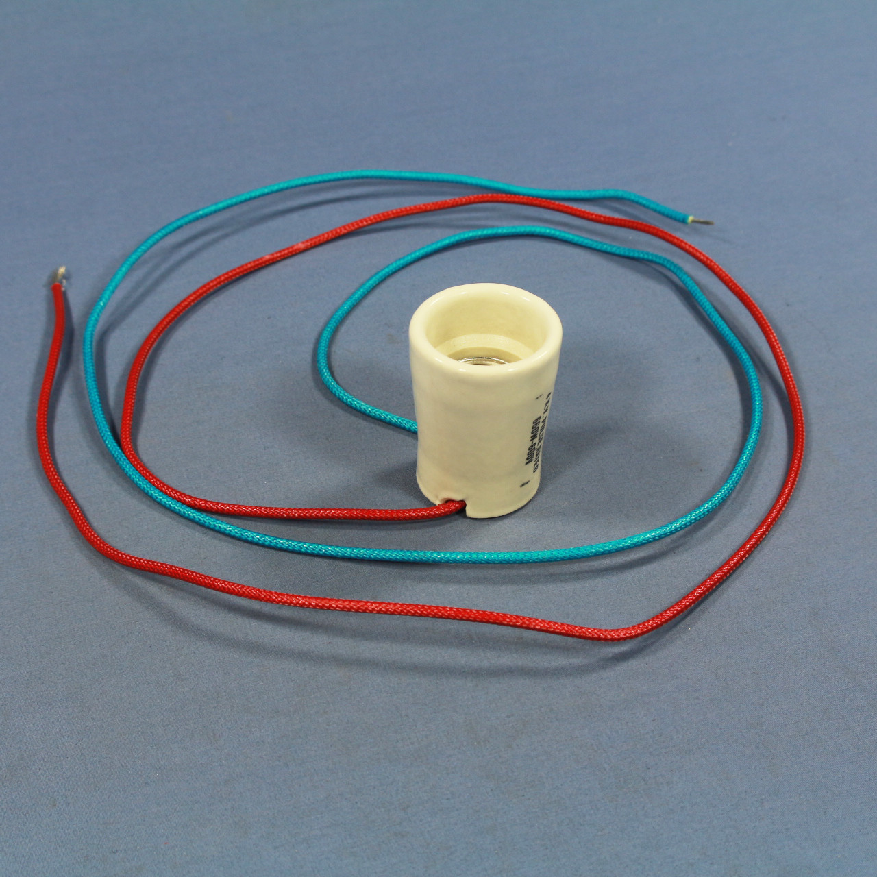 Leviton 70051 white porcelain lampholder. For use in down-light applications with the G.E. MXR 32W metal halide lamp. Glazed porcelain body with special extended design conforms to UL requirements for the live screw shell. Pulse rated with leads for open-fixture medium base lamps. Features include: