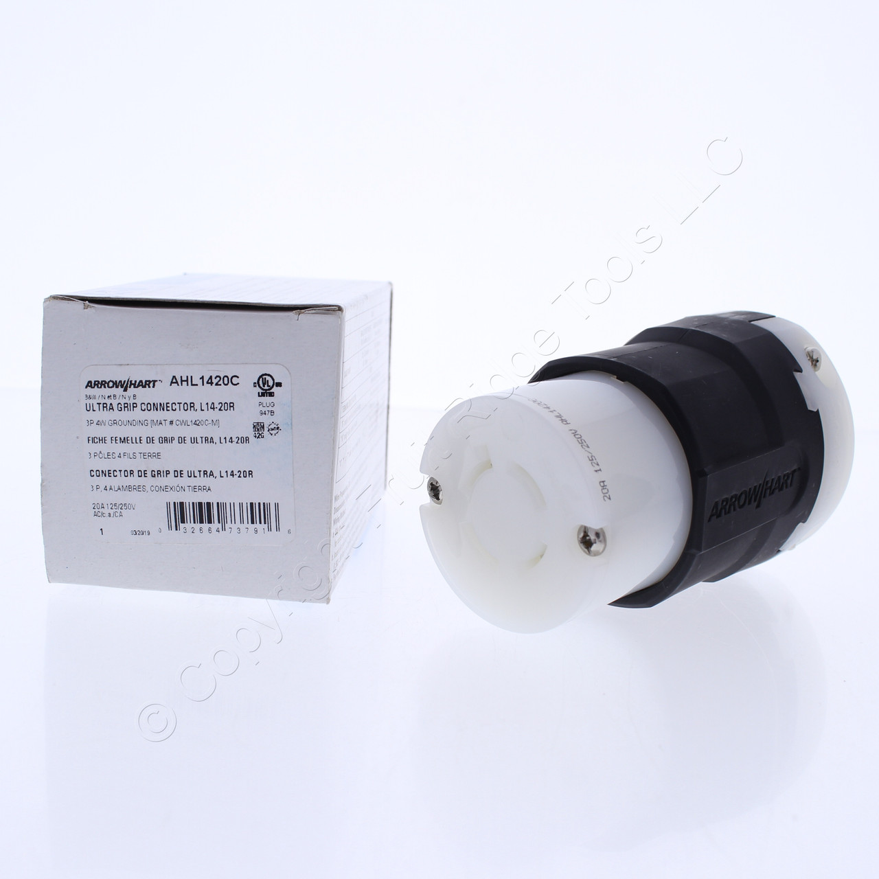 Eaton AHL1420C locking connector. Industrial Specification Grade, NEMA L14-20R, 3-pole, 4-wire, grounding, rated 20A 125/250V. Cord capacity: 0.38"-1.16". Each is individually packaged; packaging may differ from photo. Features include: