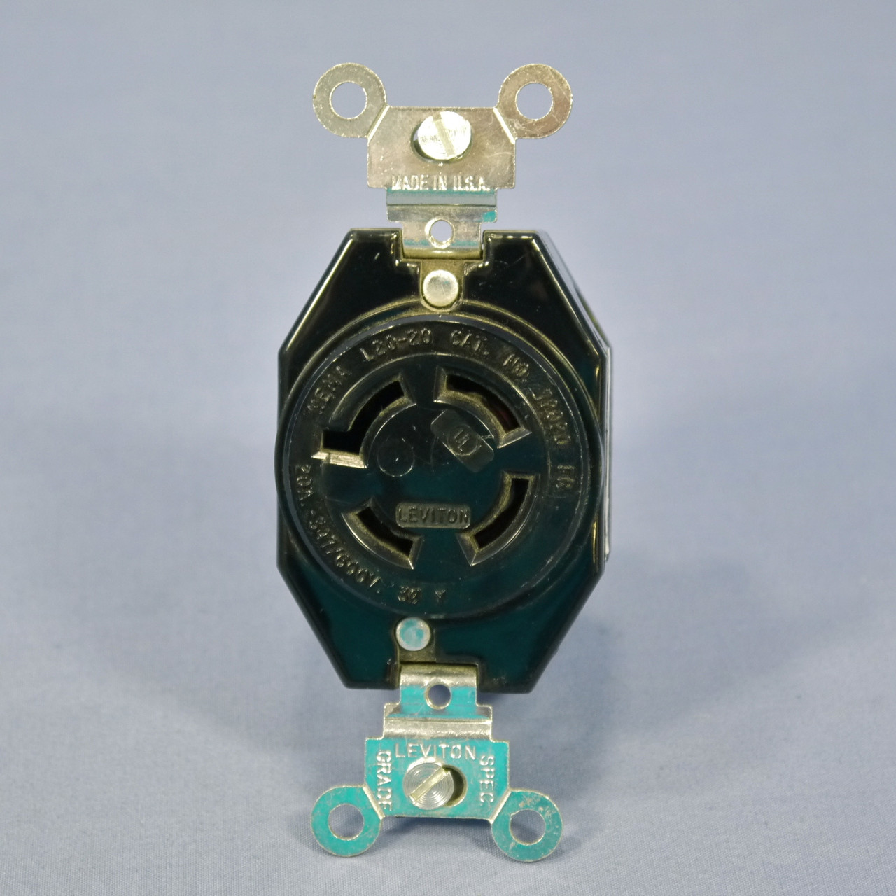 Leviton 72020-FR locking receptacle. Industrial Specification Grade, NEMA L20-20R, 4-pole, 4-wire, non-grounding, rated 20A 347/600V, 3 phase Y. Bulk packed loose with no individual packaging; as a result some may have minor dings. ITEM PICTURED IS FOR REFERENCE ONLY: SCRATCHES, SCUFFS, DINGS, and BLEMISHES WILL VARY FOR EACH INDIVIDUAL ITEM.