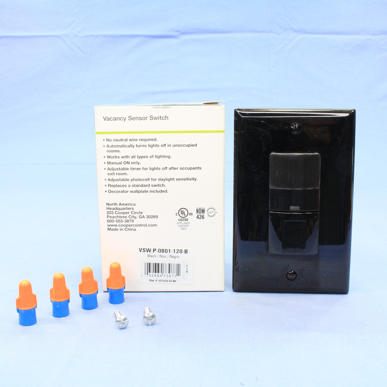 Cooper #VSW-P-0801-120-B black manual vacancy sensor. The Cooper dimmer rated at 120 volts and 600 watts Passive Infrared single or multi-way vacancy sensing wall switch is a motion sensing lighting control and conventional wall switch all-in-one that is used to for energy savings and convenience. Designed to detect motion from a heat-emitting source(such as a person entering a room) within its field-of-view and automatically switch lights ON. PIR sensors are considered line-of-sight sensors, meaning that the sensor must be able to have a direct line-of-sight to the person making the motion. The lights are turned ON by pressing the pushbutton. The sensor provides true multi-way ON/OFF control. When the lights have been activated, the lights will remain on as long as on the sensor(s) continue to detect motion. The occupant may manually turn OFF the lighting by pressing the ON/OFF button on any of the connected devices. If the room becomes vacant and the lights are ON, the lights will turn OFF when the unit that detected motion last times-out. Each is individually packaged; packaging may differ from photos. Features include: