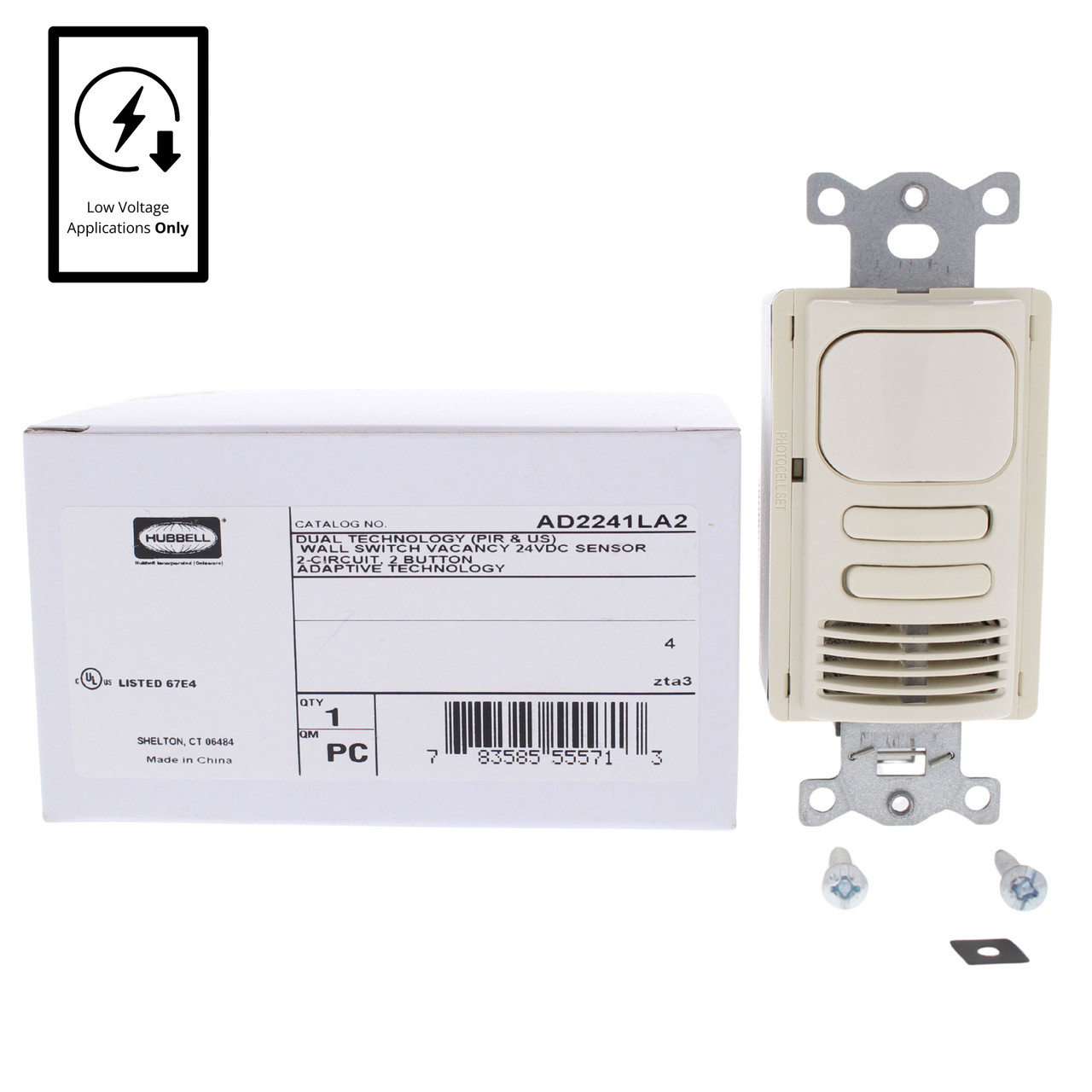 Hubbell AD2241LA2 light almond 2-circuit low voltage 24VDC vacancy sensor switch; requires Hubbell CU300xx series control units (purchased separately). A vacancy switch is designed to be turned ON manually and then turns OFF automatically a preset time after motion has ceased. Vacancy switches have greater savings over occupancy sensors because lights are only turned on when the user needs them. Dual relay sensor allows control of 2 load circuits. Offers an energy savings solution for use with lighting, HVAC and to comply with Automatic Receptacle Control. The sensor operates with a control unit (purchased separately) enabling line voltage and low voltage wiring to be easily separated. This makes for an ideal cost effective solution when used in smaller spaces such as private offices, conference rooms and restrooms. Equipped with Hubbell patented self-adaptive Intelli-DAPT technology which automatically adjusts the sensor’s sensitivity and timer settings to optimize performance based on occupancy patterns. The sensor constantly learns and adjusts appropriately. Features include: