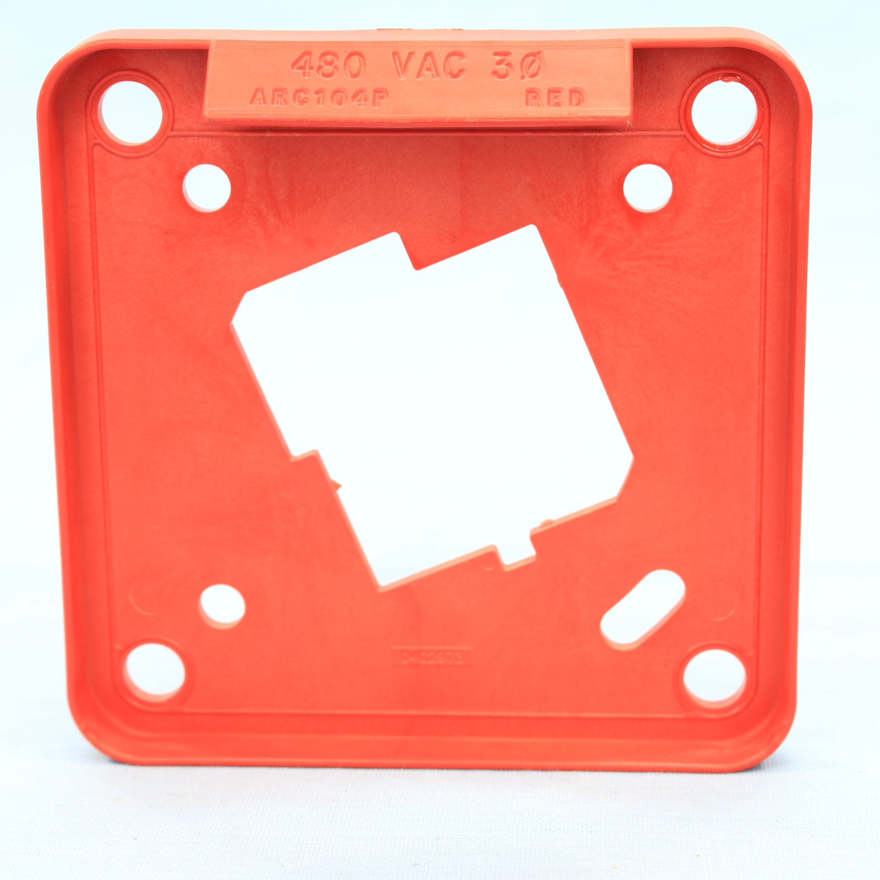 Cooper/Crouse Hinds WD034817 (0402973) polarizer plate; Cooper Wiring Devices/Crouse-Hinds is a division of Eaton. Plate is marked "480 VAC 3Ø ARC104P RED" on the tab with "0402973" cast into the plate. For use with 60A APRC104 equivalent pin and sleeve receptacles.