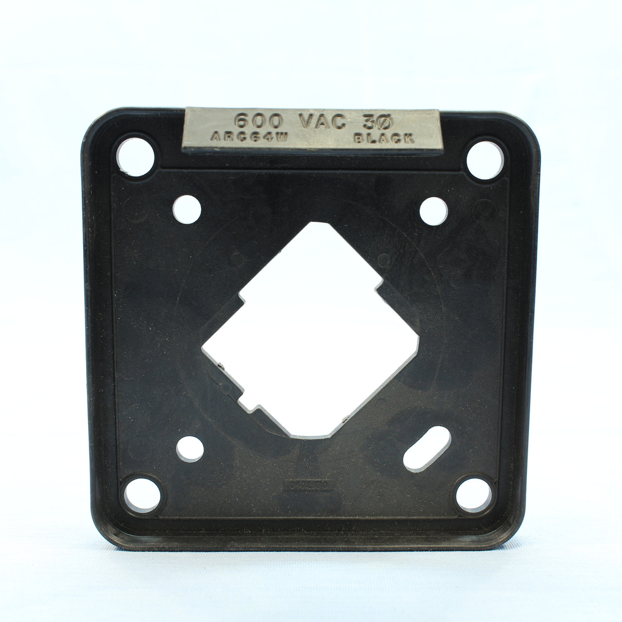Cooper/Crouse Hinds WD03367 (0402970) polarizer plate; Cooper Wiring Devices/Crouse-Hinds is a division of Eaton. Plate is marked "600 VAC 3Ø ARC64W BLACK" on the tab with "0402970" cast into the plate. For use with 60A APRC64 equivalent pin and sleeve receptacles.