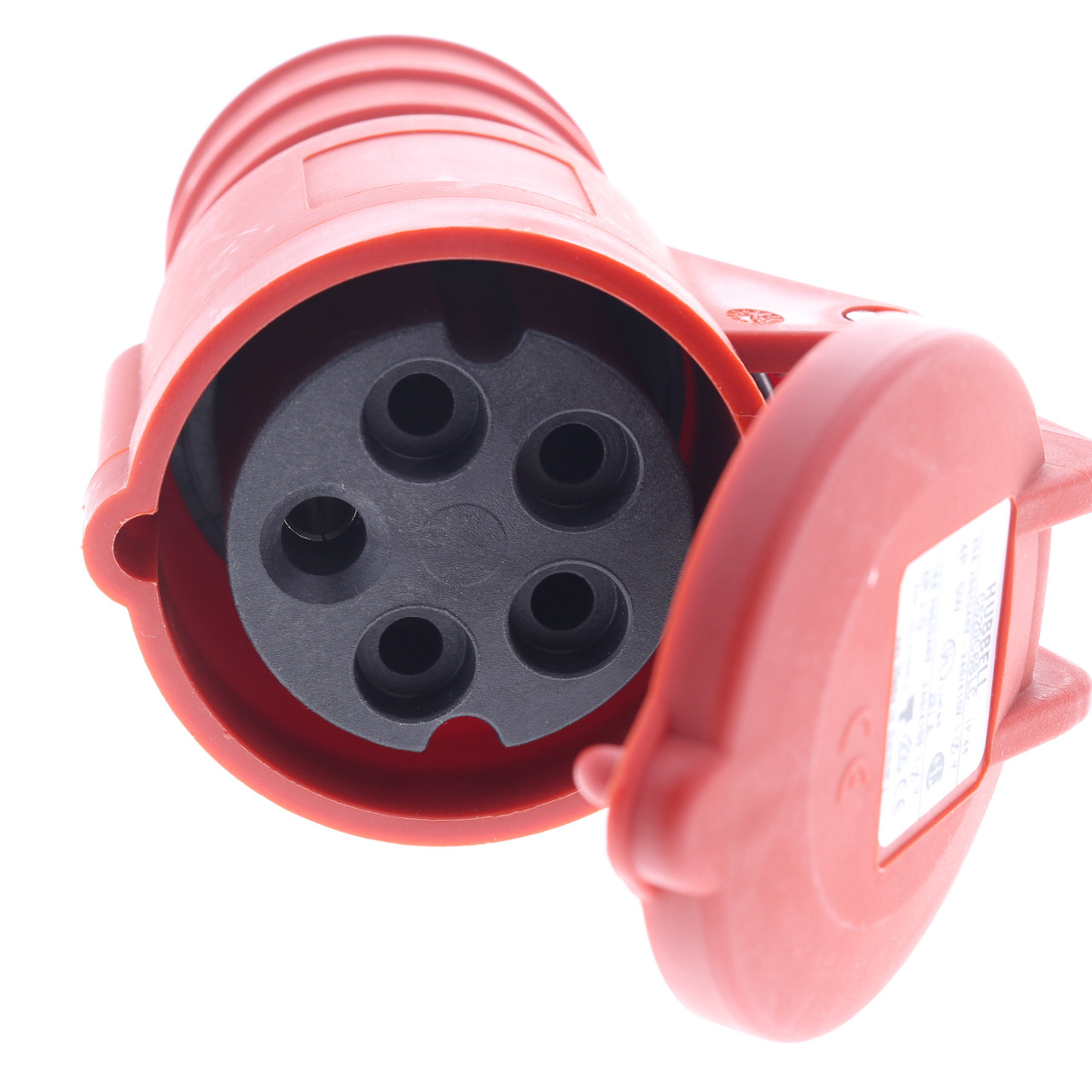 Hubbell C520C6SLC red pin and sleeve splashproof IP44 connector. Rated 3-Phase 20A 200/346 - 240/415V, 4-Pole 5-Wire grounding 14-10 AWG gauge; Cord grip range 0.385"-0.770". Device measures 6.38" (length) x 1.82" (wire-way) x 2.28" (Terminal end) x 3.07" (Terminal end + hinge). The device has a natural designed grip that makes it easy to work with during connection. The cable entry is for flex and convex cables and the cable is secured through a flip aside cable clamp. The installation is easy done due to the clear terminal marking. After connecting the cables the housing is easily closed by a twist. Bulk packed loose with no individual packaging or instructions. Features include: