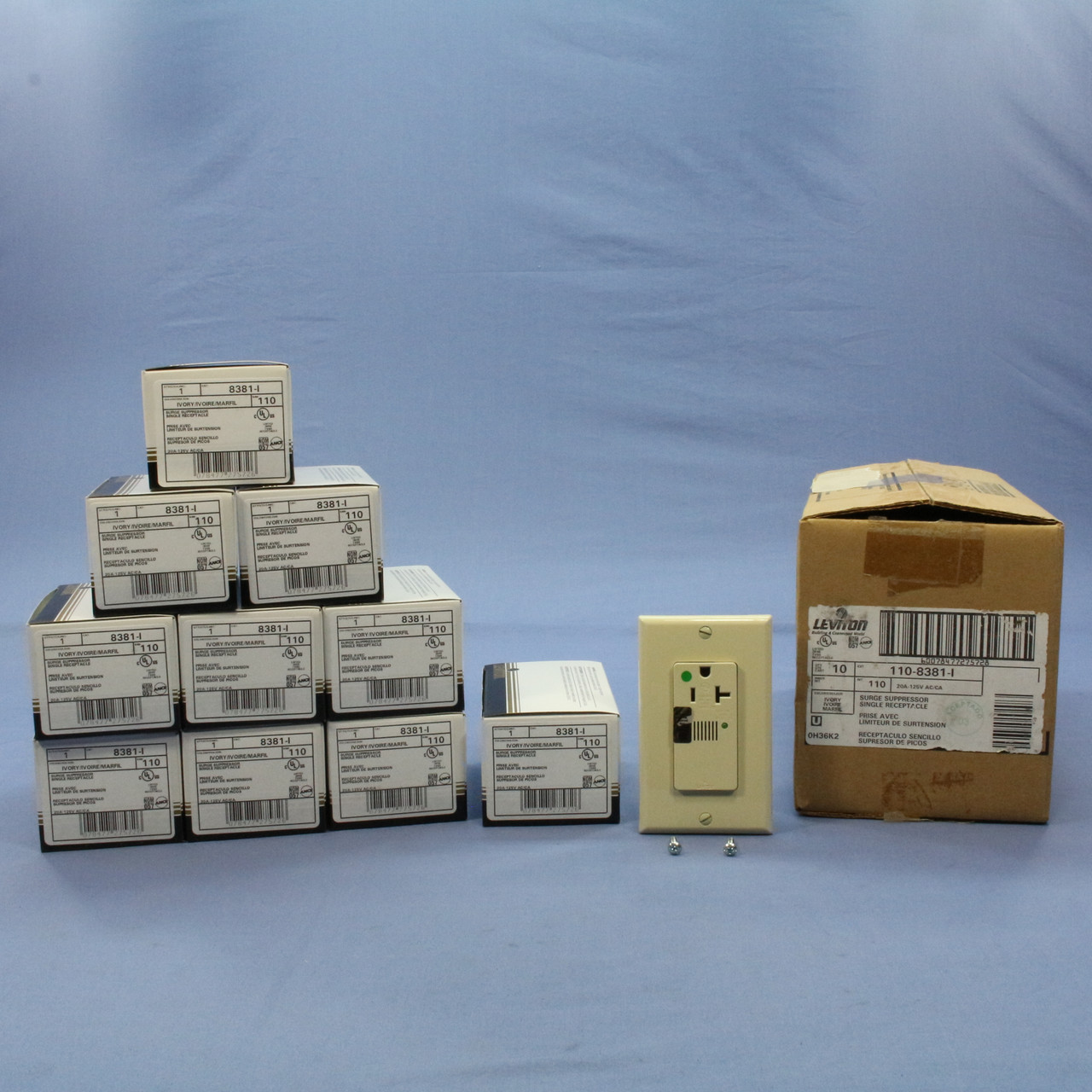 10 Leviton 8381-I ivory Decora hospital grade single outlet receptacles with surge suppression and audible alarm. The single outlet design is good for locations where you want to dedicate an outlet/circuit to a particular appliance or machine: workshops, computer rooms, offices, etc. Protects sensitive equipment from potentially damaging transient voltage spikes. Hospital Grade, NEMA 5-20R, 2-pole, 3-wire, side wired, grounding, rated 20A 125VAC. Each is individually packaged with instructions. Features include: