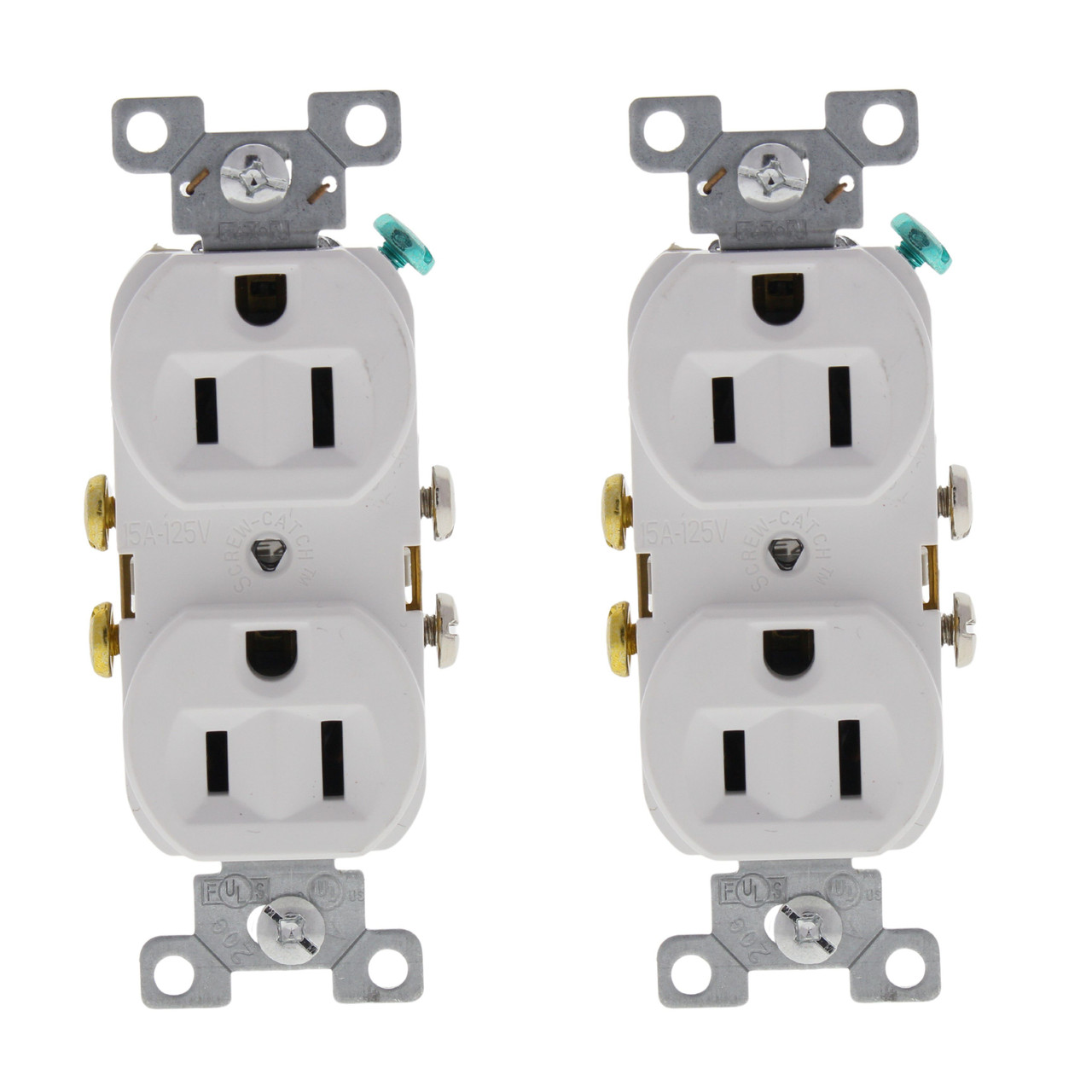 2 Eaton CR15W white commercial receptacles. Commercial Specification Grade, NEMA 5-15R, 2-pole, 3-wire, grounding, side wired, rated 15A 125V. Bulk packed loose with no individual packaging; as a result some may have minor dings. ITEM PICTURED IS FOR REFERENCE ONLY: SCRATCHES, SCUFFS, DINGS, and BLEMISHES WILL VARY FOR EACH INDIVIDUAL ITEM. Features include: